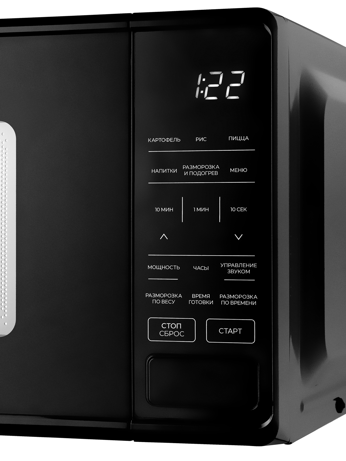 9 режимов приготовления: картофель, рис, пицца, напитки, разморозка и разогрев, разогрев, попкорн, суп, овощи
