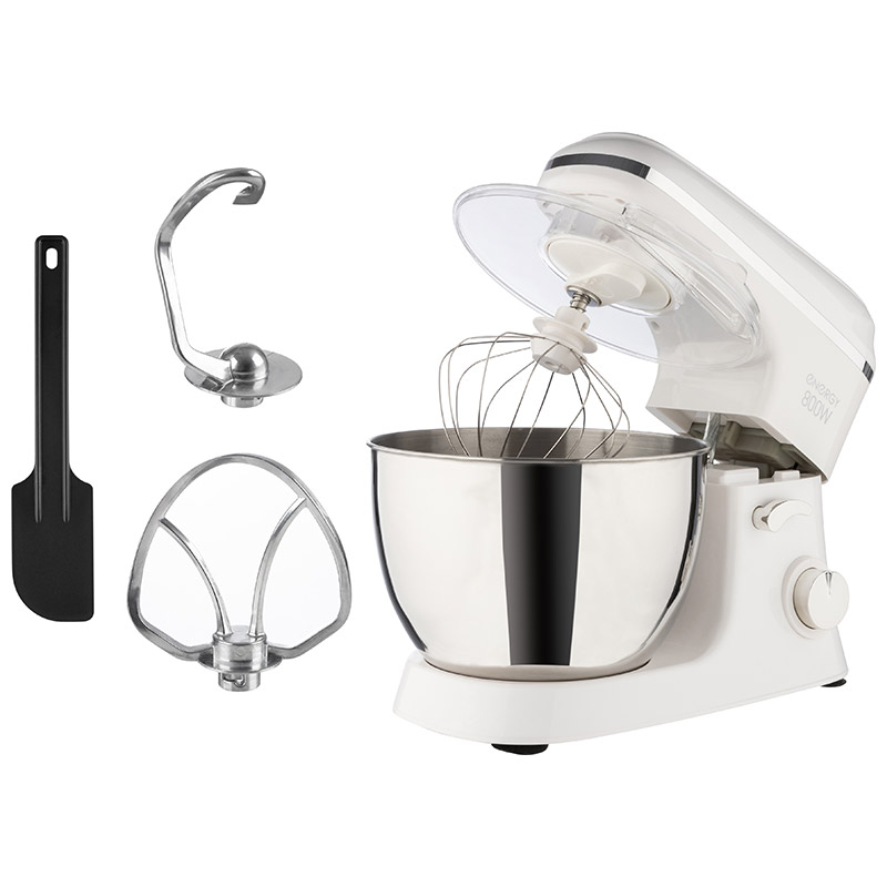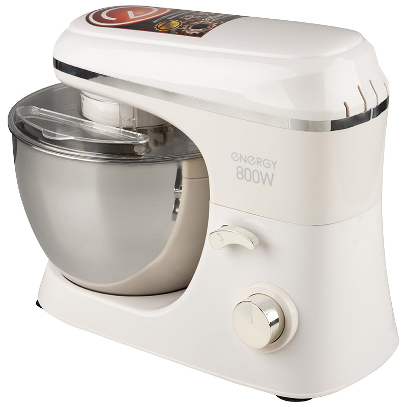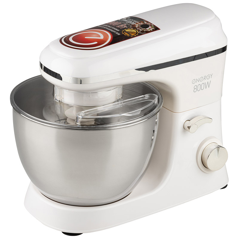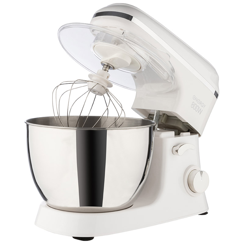 Миксер стационарный с чашей Мощность 800Вт Планетарное смешивание Прозрачная защитная крышка с отверстием для добавления ингредиентов 5 скоростей Объем чаши 5л Прорезиненные ножки-липучки протов скольжения Насадки в комплекте: венчик для взбивания, насадка крюк для замешивания теста, насадка для смешивания, лопатка Длина шнура 1 м