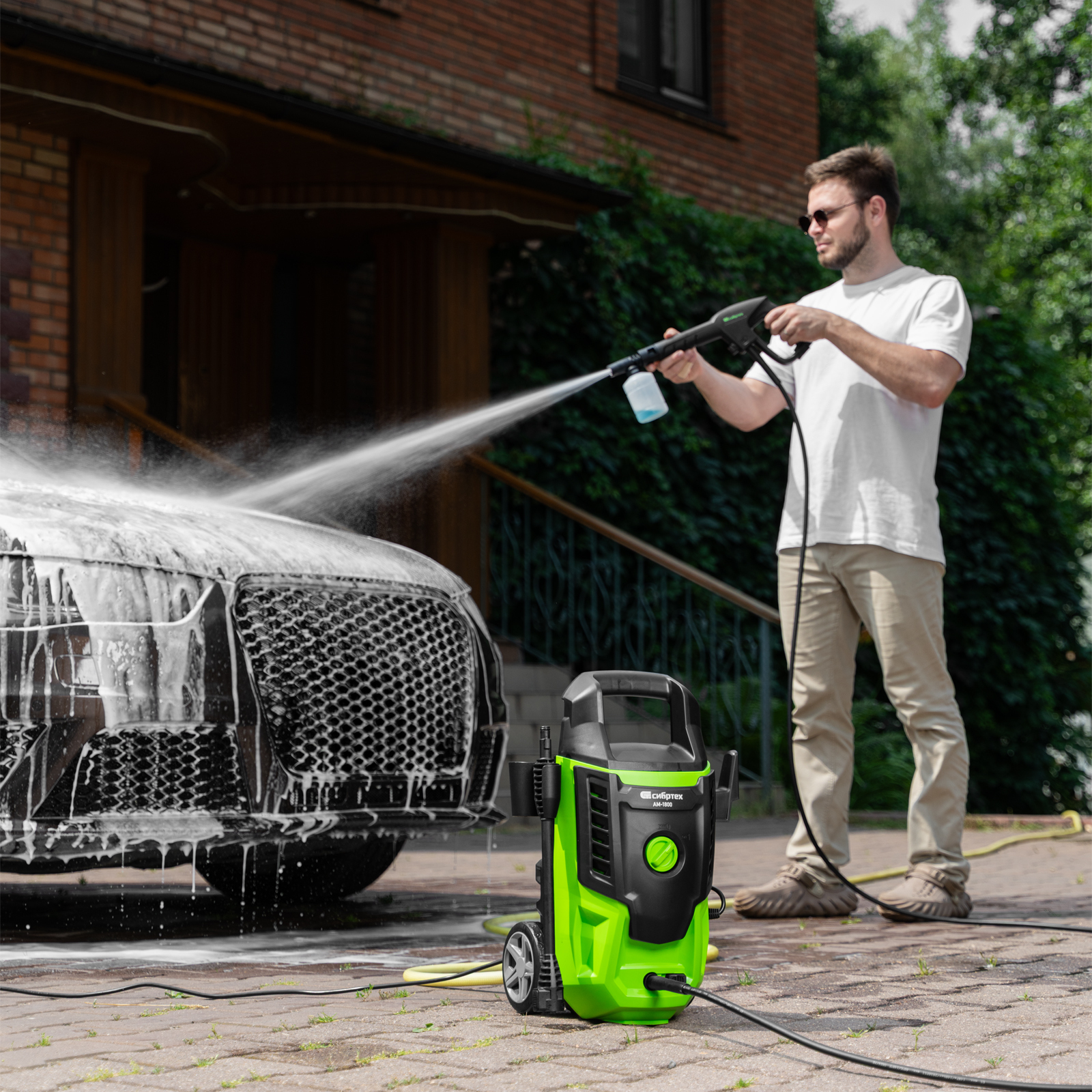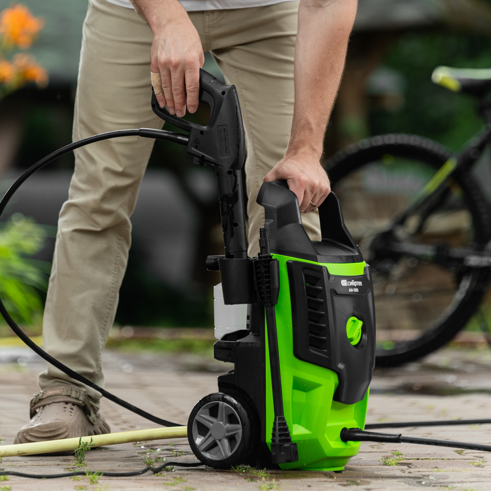 Свободное передвижение по рабочей зоне — длина сетевого кабеля и шланга составляет 5 м, что позволяет реже перемещать мойку во время работы.