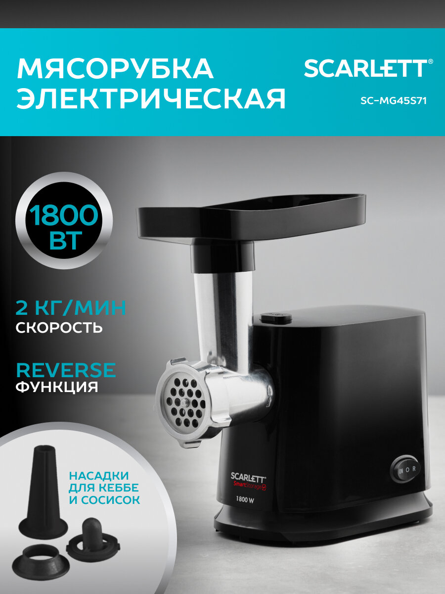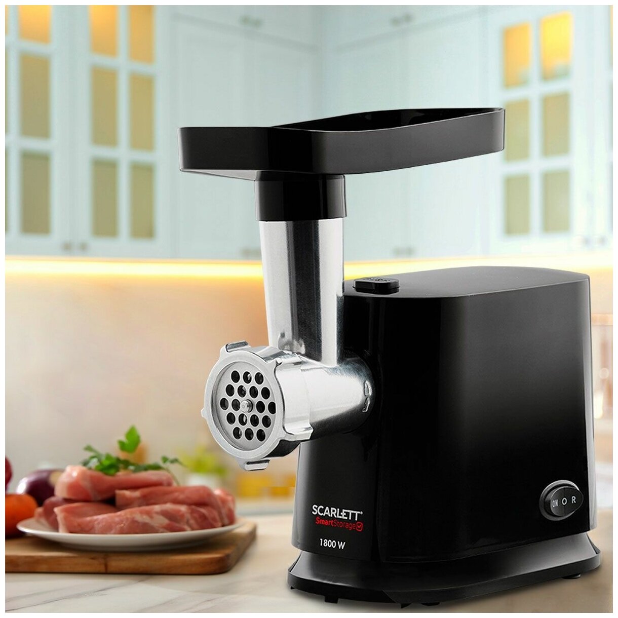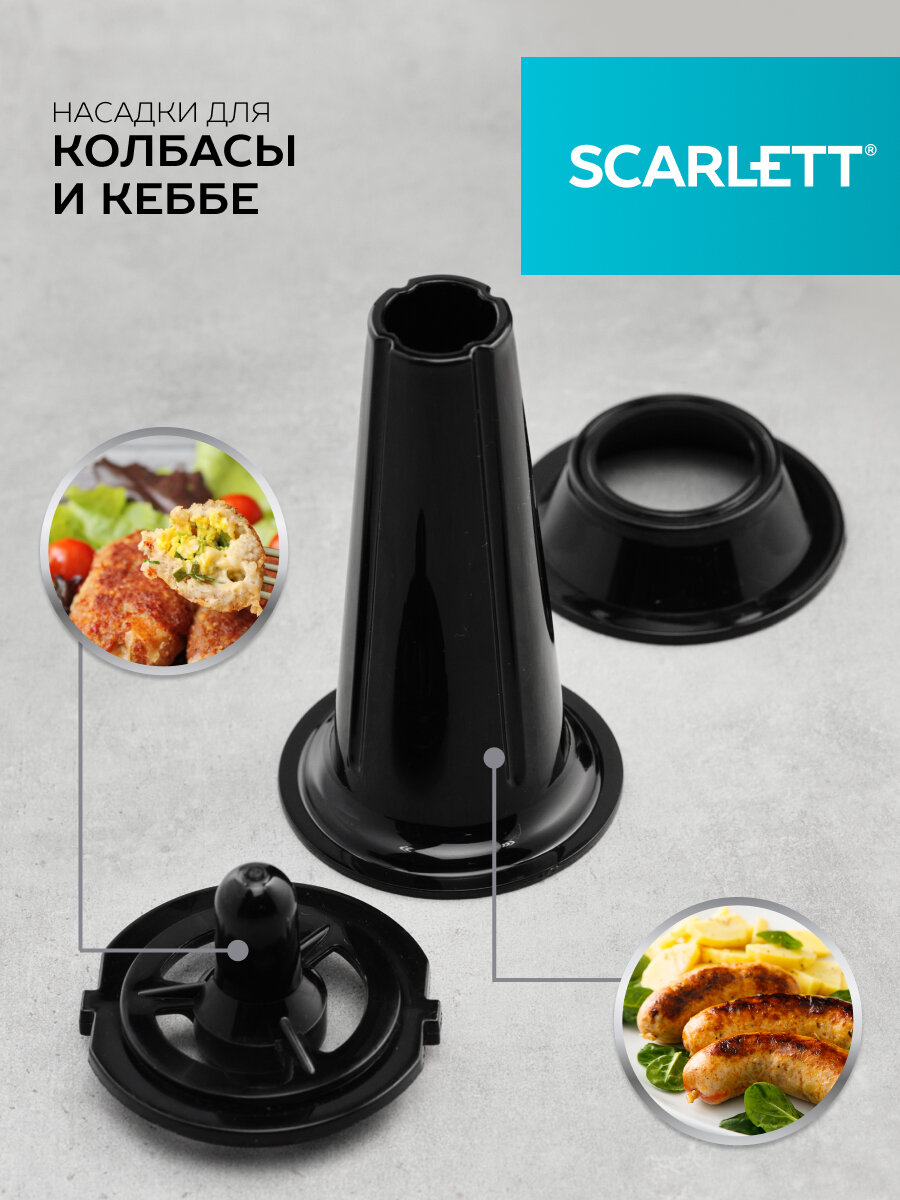 комплектация: мясорубка, 2 перфорированных диска для фарша, насадка для колбас, насадка для кеббе, лоток, толкатель, документация; перфорированные диски для мяса, размер отверстий мм: 5 и 7; материал лотка: пластик; количество насадок для приготовления колбас: 1