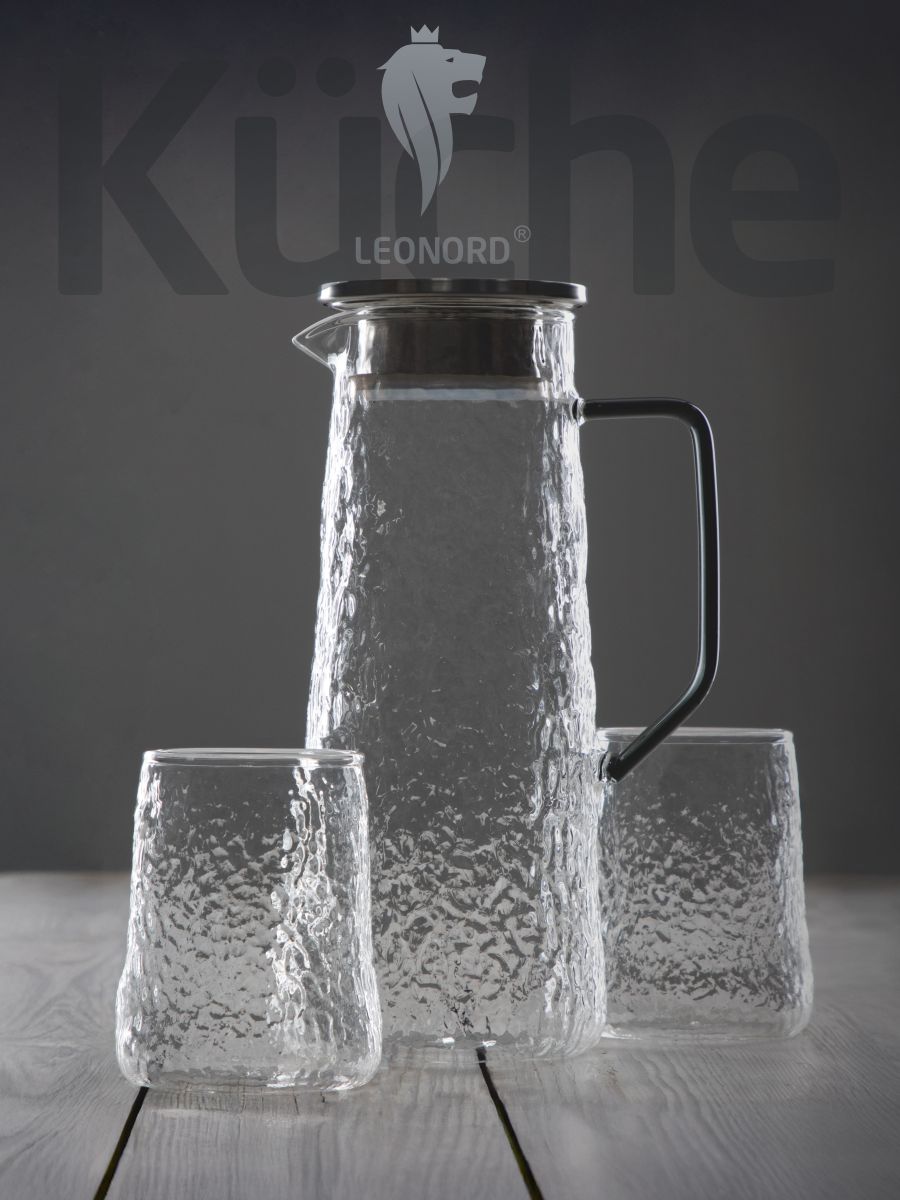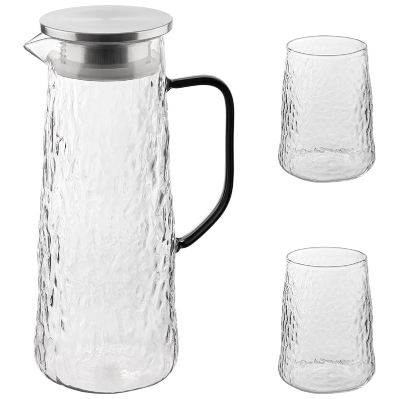 Набор из 3 предметов AROMA: кувшин 1,5 л + 2 стакана по 450 мл из боросиликатного рельефного стекла Материал: боросиликатное стекло, нержавеющая сталь, силикон. Ручка у кувшина черная (цветное стекло).