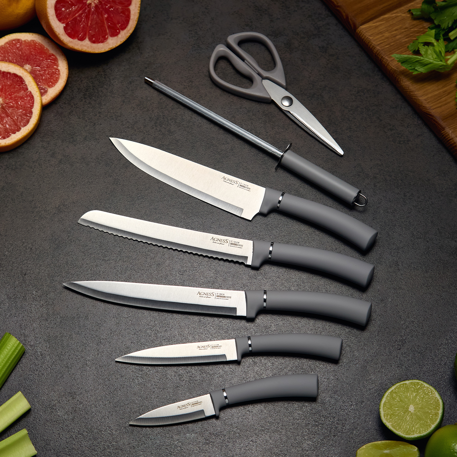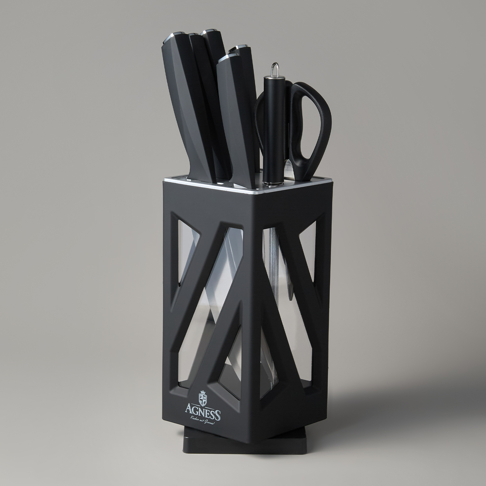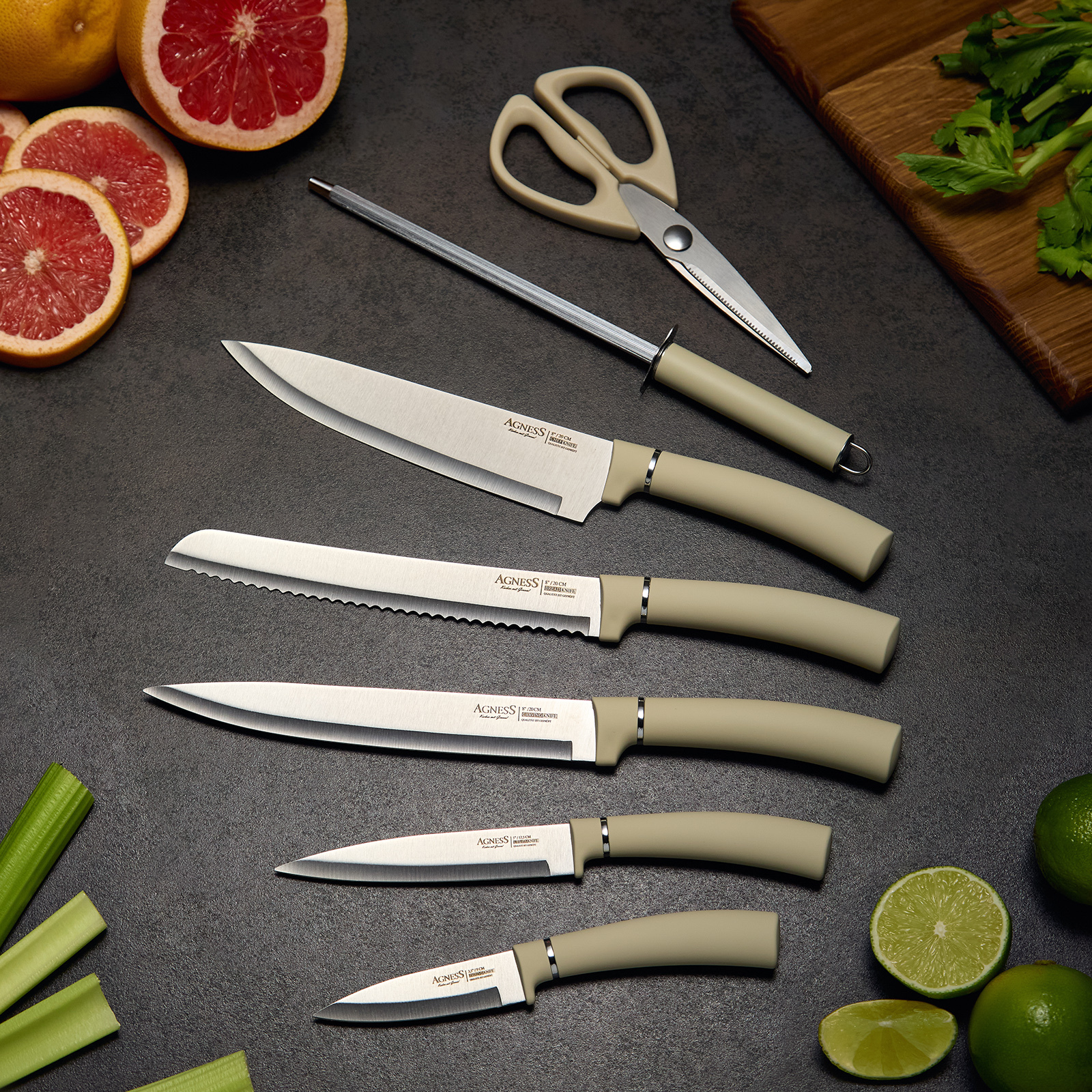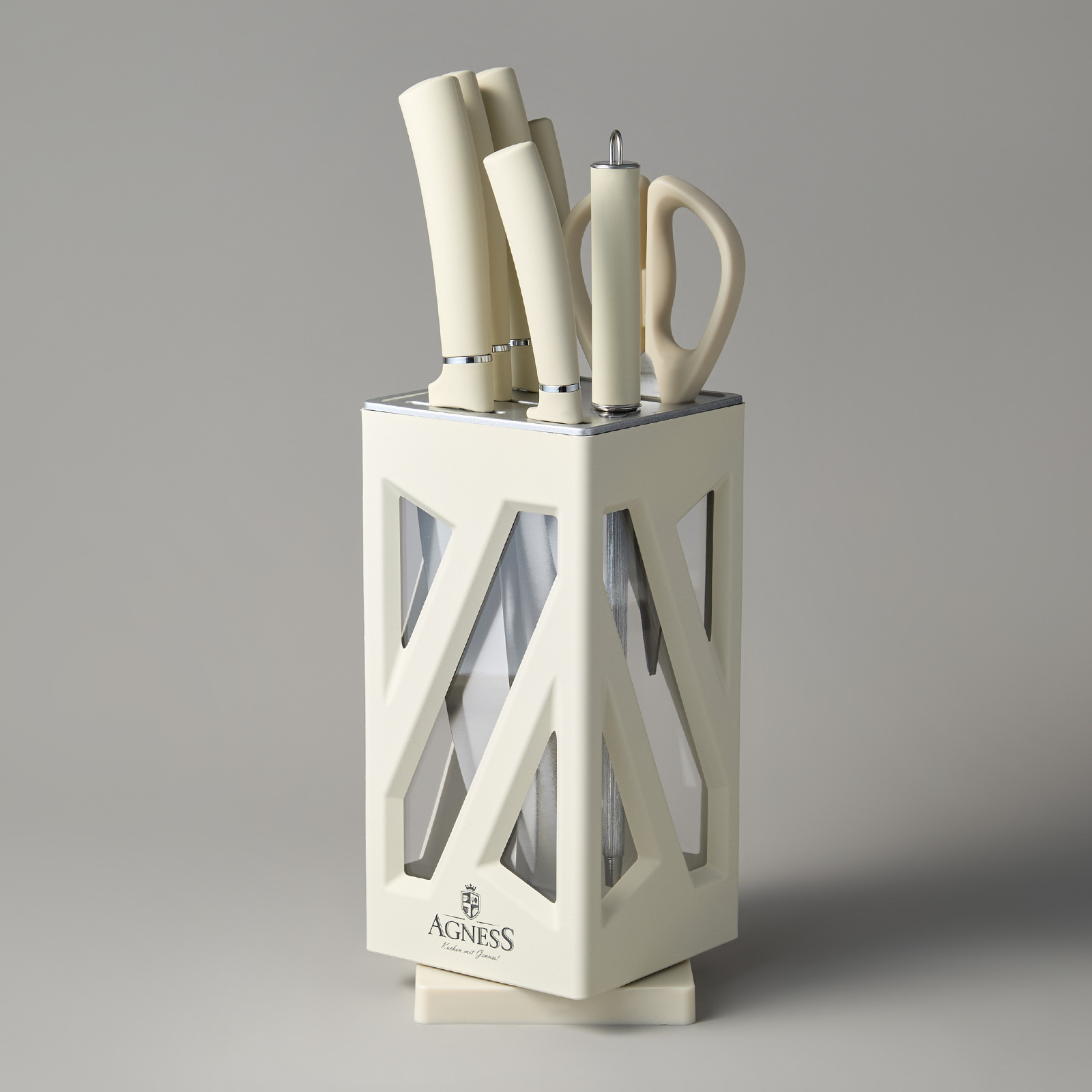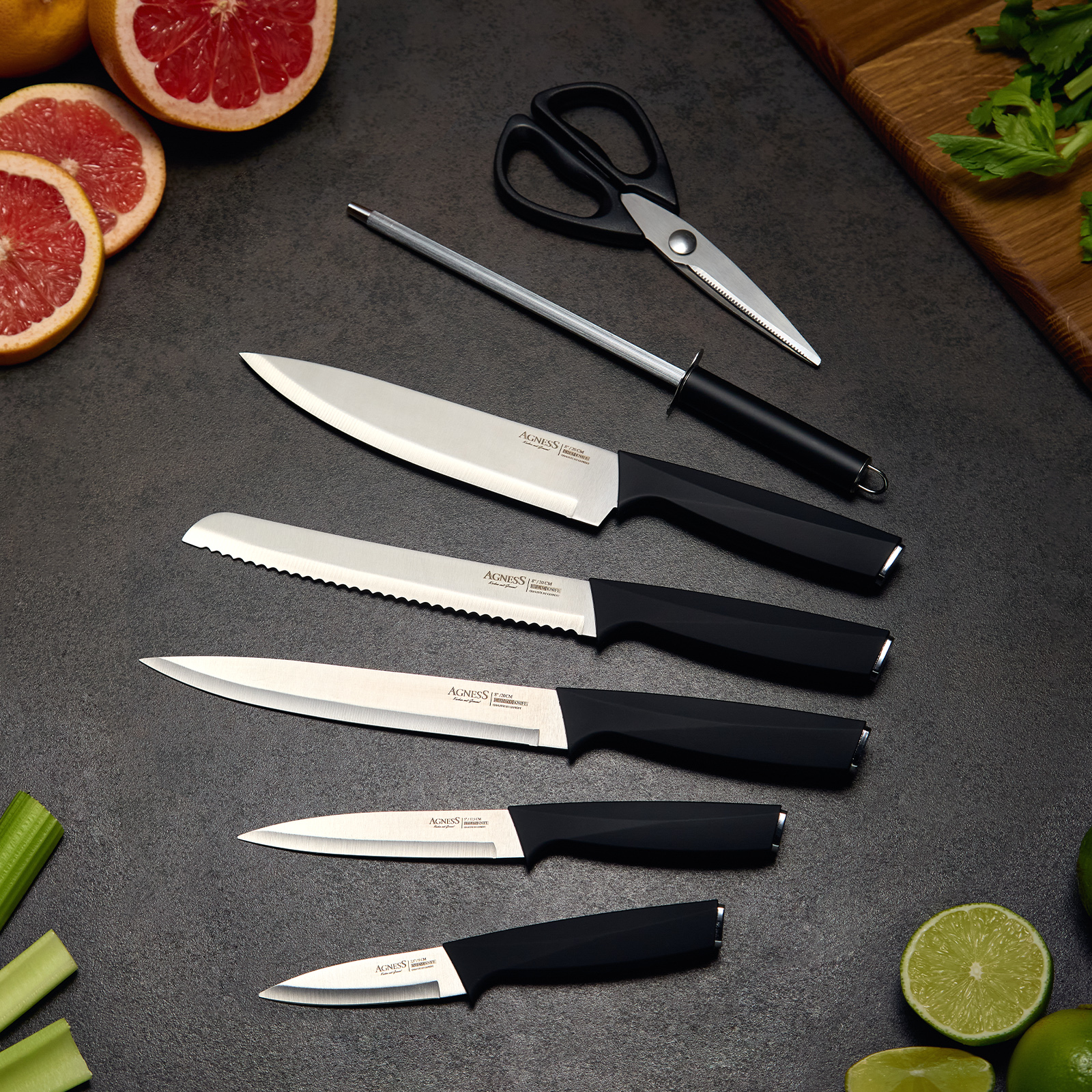 ● Состав набора: Нож поварской 20см, Нож для нарезки 20см, Нож для хлеба 20см, Нож универсальный 12,5см, Нож для чистки овощей и фруктов, 9см, Мусат, Ножницы для птицы, Вращающаяся подставка.
