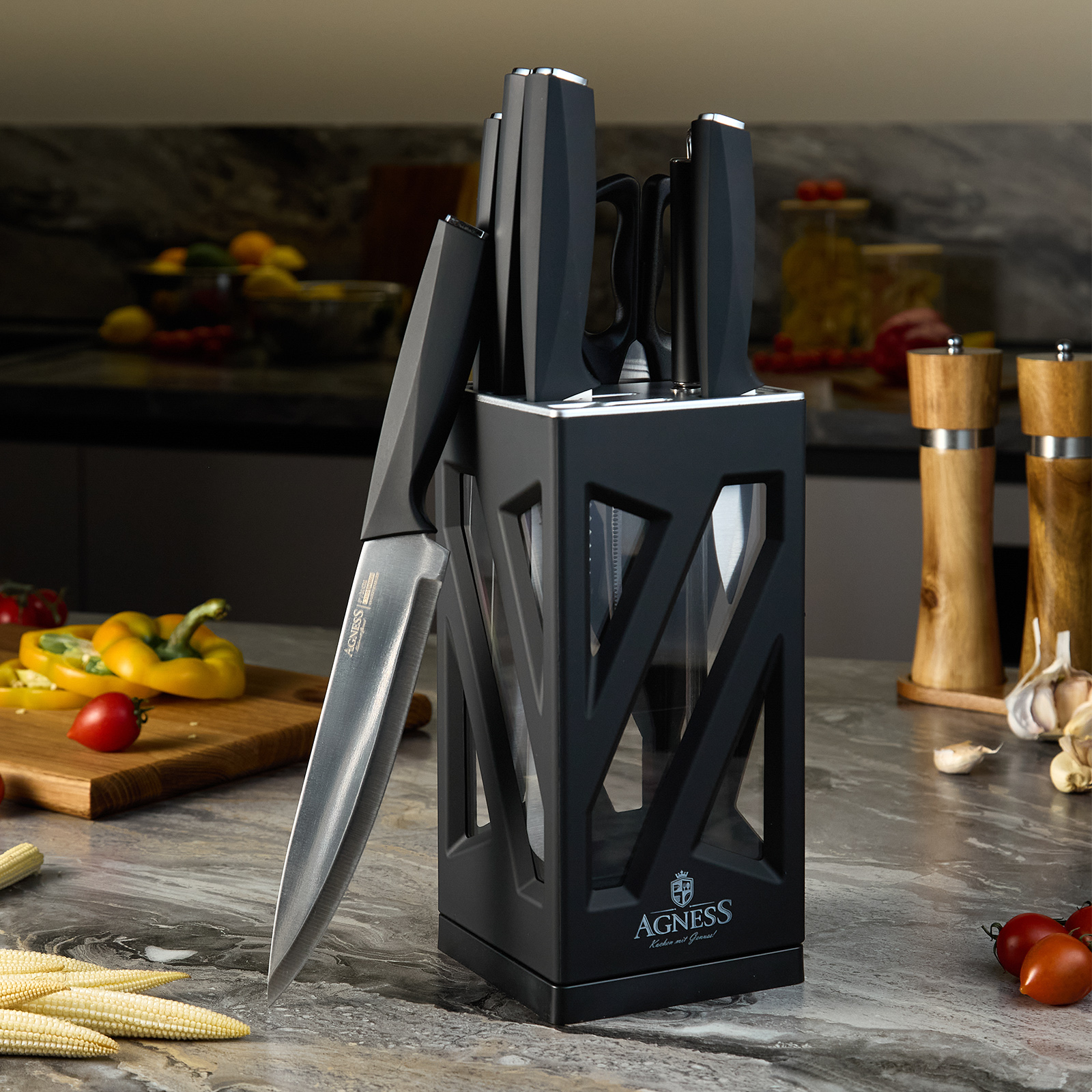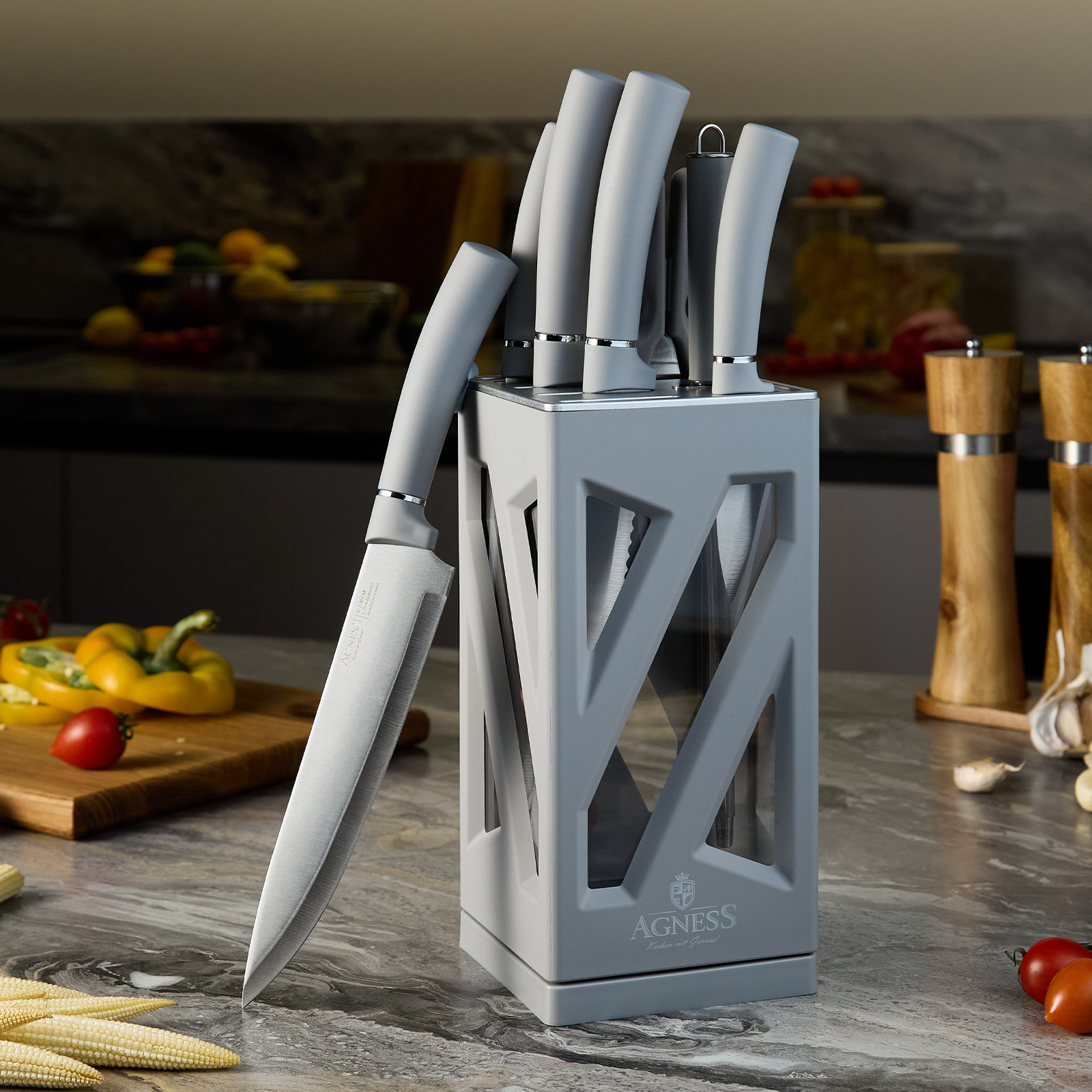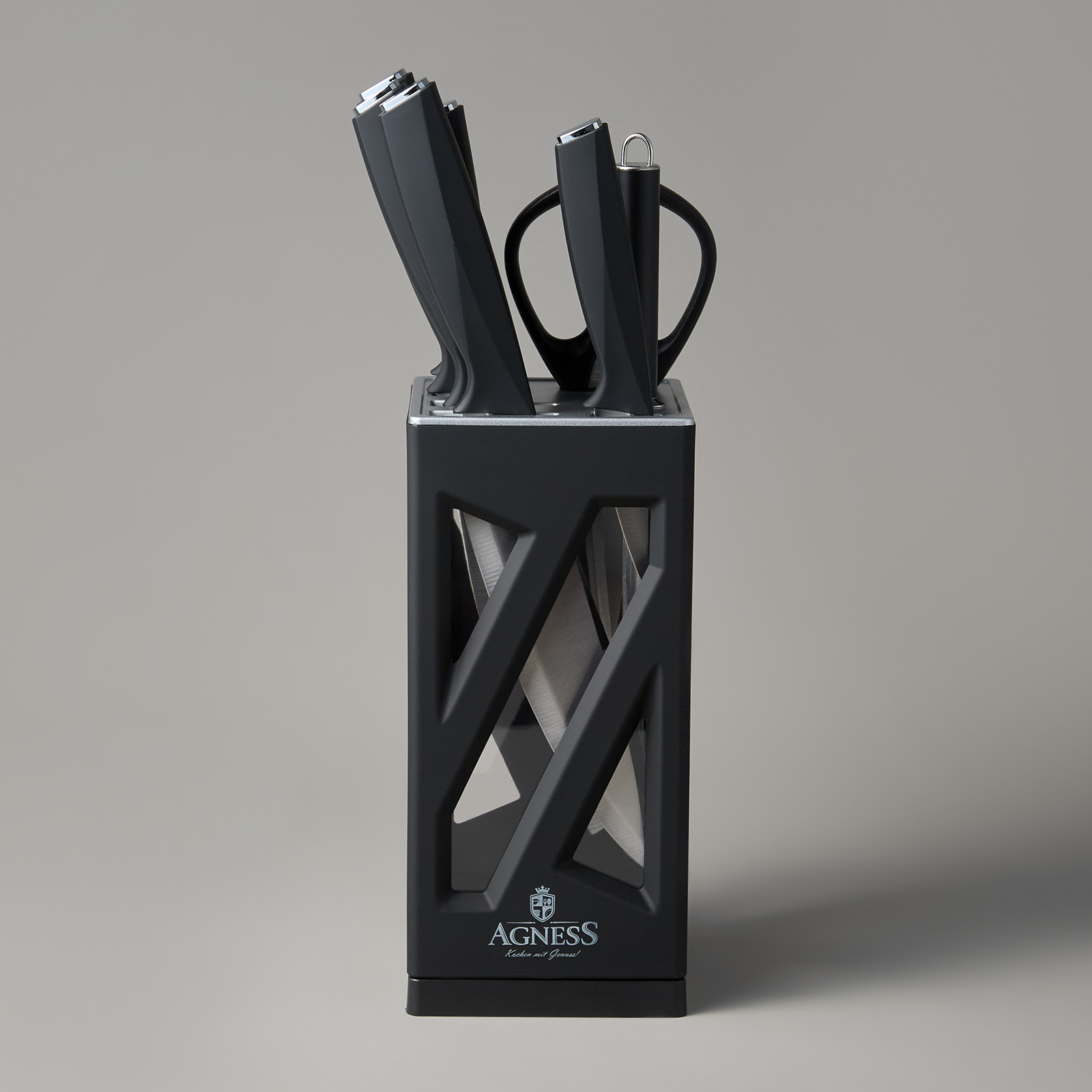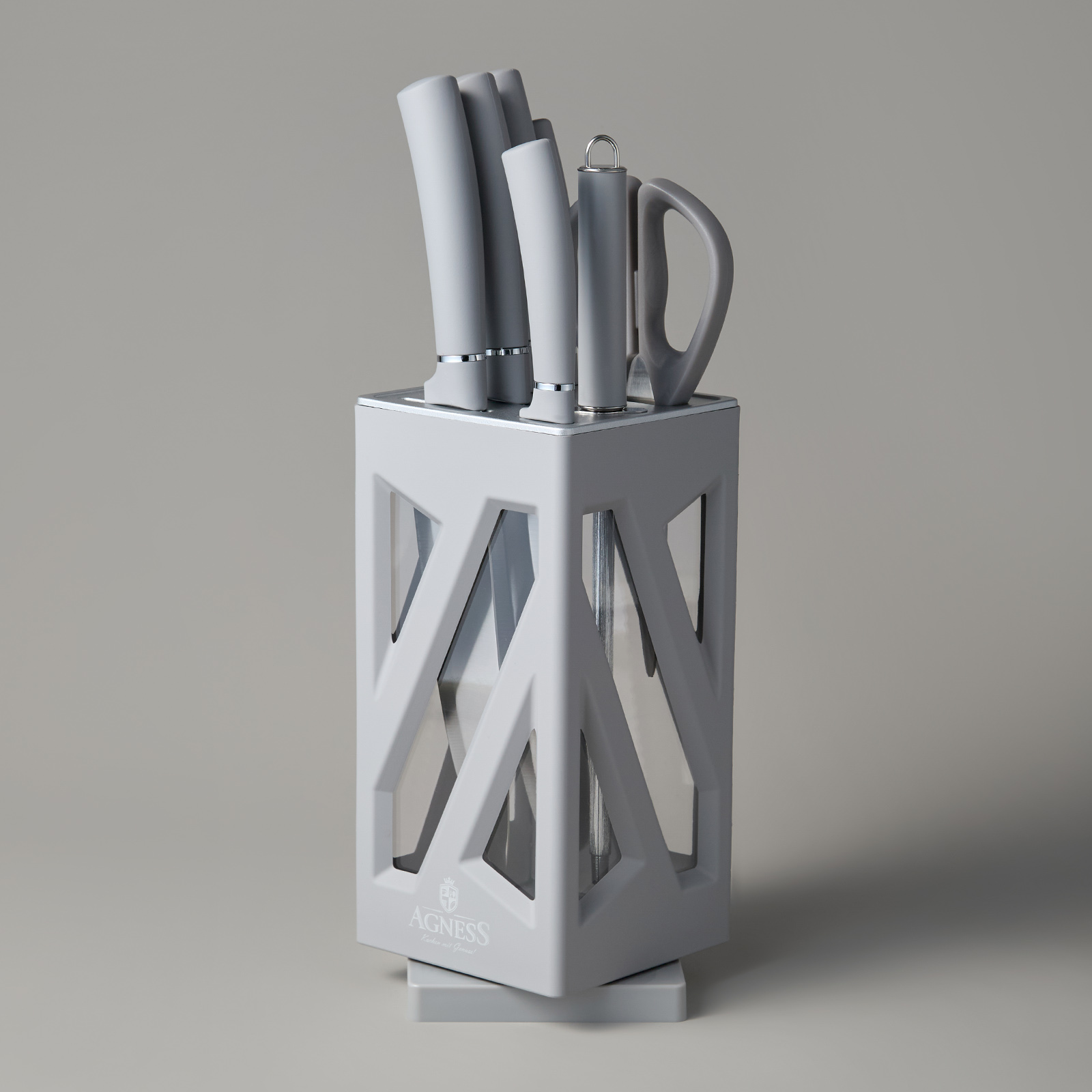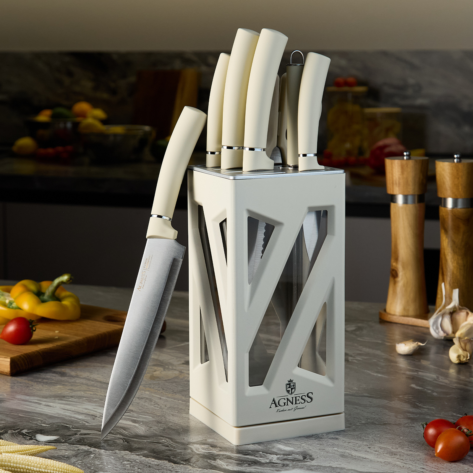 ● Состав набора: Нож поварской 20см, Нож для нарезки 20см, Нож для хлеба 20см, Нож универсальный 12,5см, Нож для чистки овощей и фруктов, 9см, Мусат, Ножницы для птицы, Вращающаяся подставка.