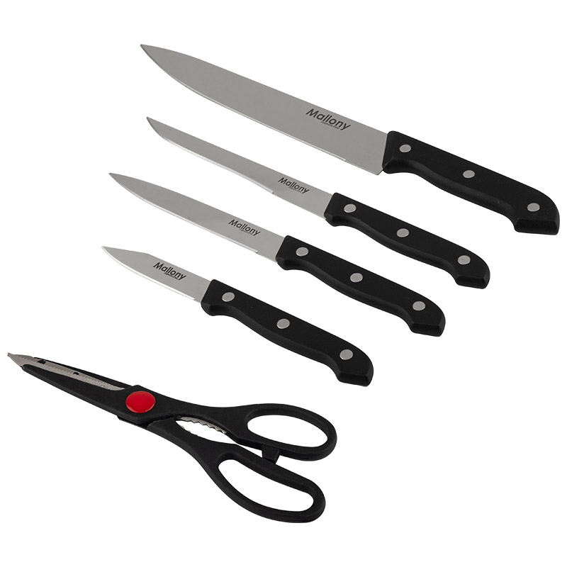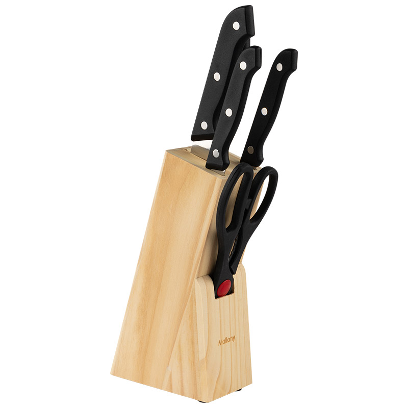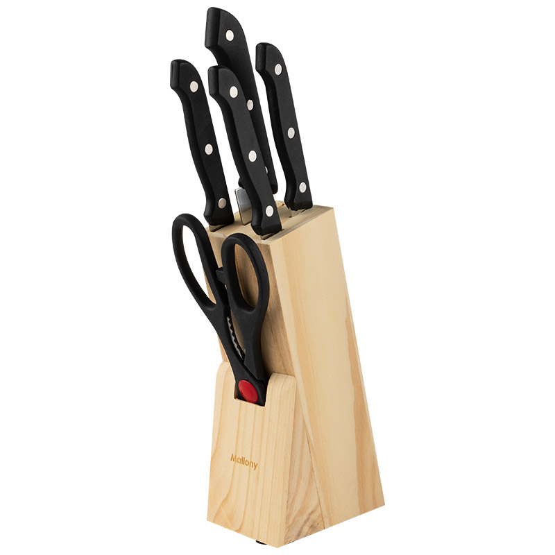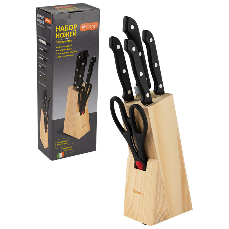 Набор ножей 6 предметов: - нож поварской – 20 см - нож филейный – 13,5 см - нож универсальный – 12,5 см - нож для овощей – 8 см - кухонные ножницы - деревянная подставка Материал: нерж.сталь (3CR13), пластмасса, дерево Не рекомендуется мыть в посудомоечной машине. Упаковка: цветная коробка