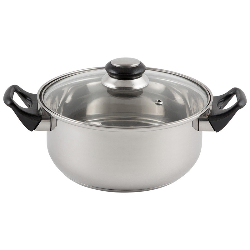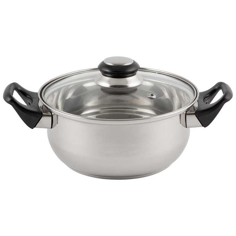 Набор посуды из 4 предметов из нерж стали с крышками из жаропрочного стекла с отверстиями для выпуска пара. 2 кастрюли - 2 и 2,8 л (18*8,5 см; 20*9,5 см) 3 слойное капсулированное дно ( 0.3мм сталь +0.5 мм алюминий +0.3 мм сталь) Толщина стенок: 0,28 мм Материал: нерж сталь, алюминий, бакелит, стекло Не подходит для индукции. Не рекомендуется мыть в посудомоечной машине.