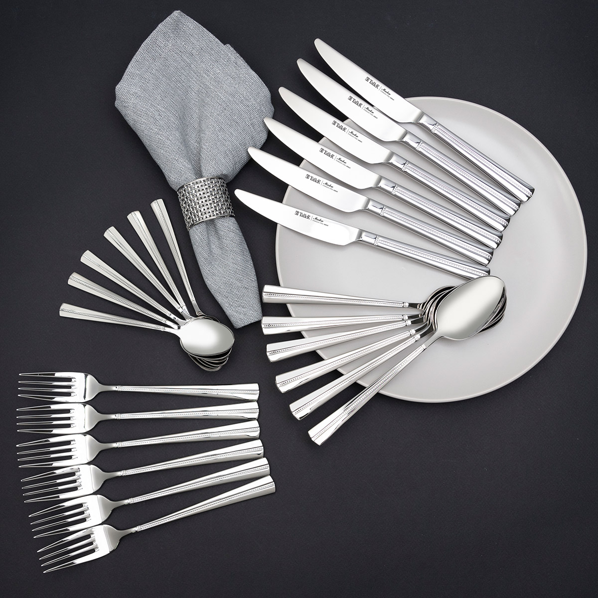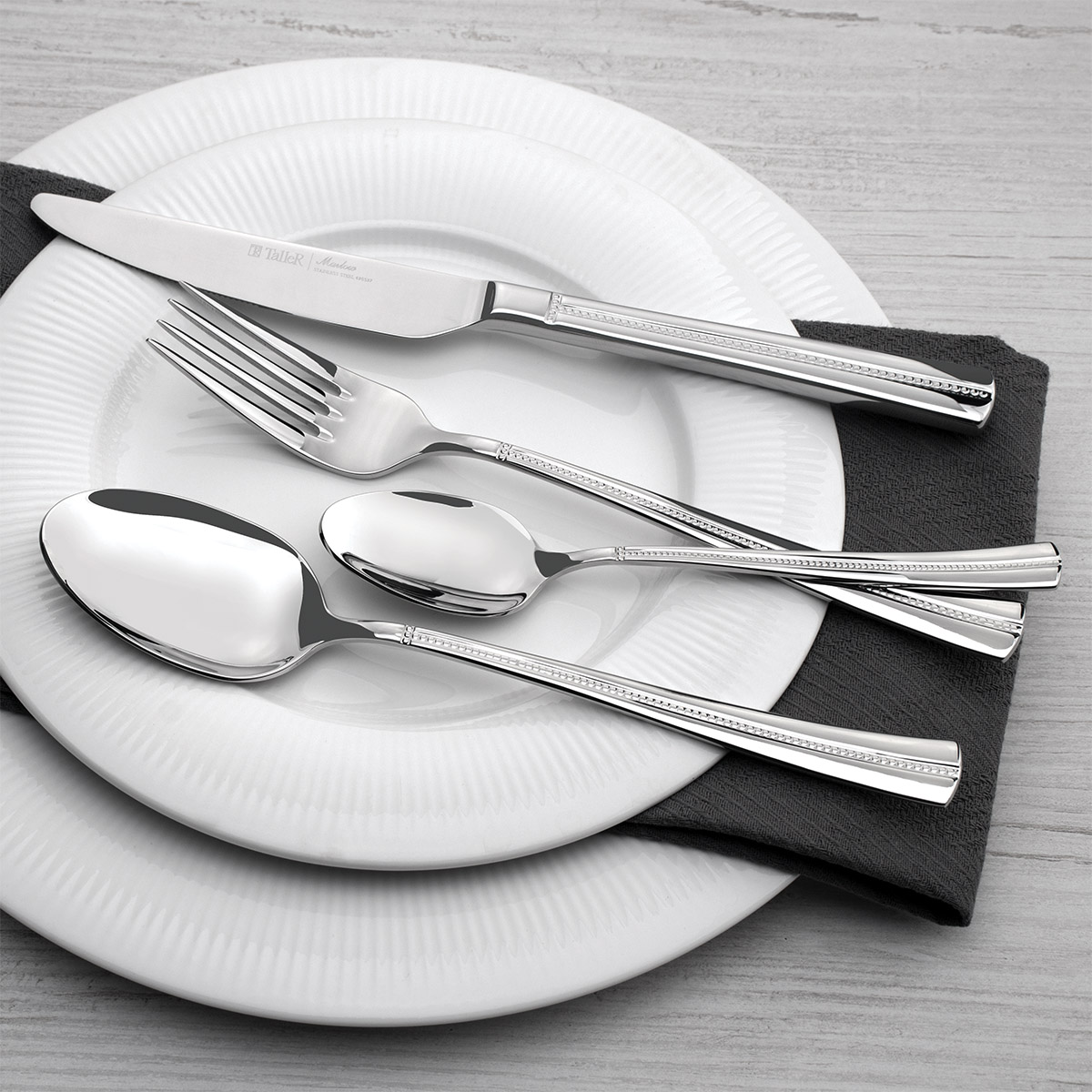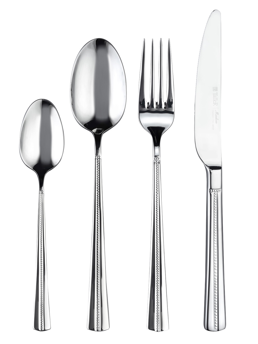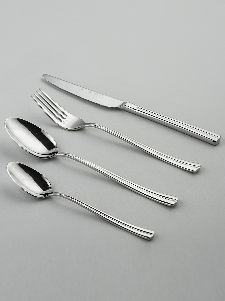 Столовые приборы (кроме лезвий ножей) изготовлены из высококачественной нержавеющей стали марки 18/10: