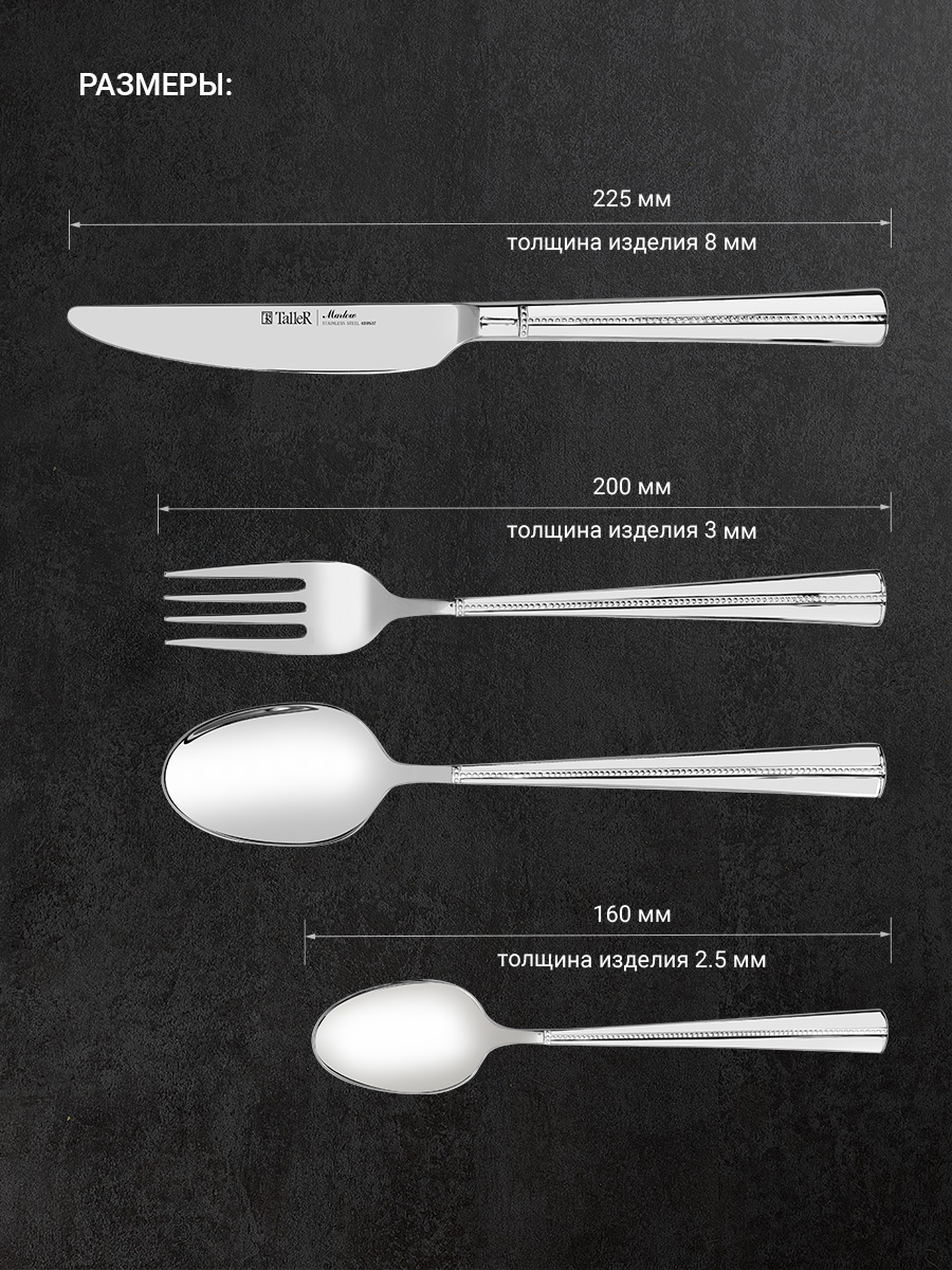 Толщина приборов: нож - 9 мм, столовая ложка - 3 мм, вилка - 3 мм, чайная ложка - 2,5 мм.