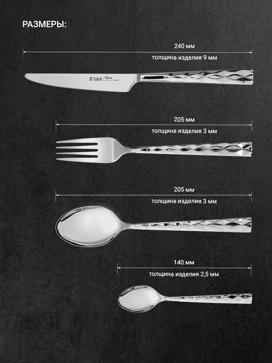 Приборы столовые (кроме лезвий ножей) изготовлены из высококачественной нержавеющей стали марки 18/10. Прочны и устойчивы к деформации. Обладают высокими антикоррозийными свойствами. Устойчивы к воздействию кислот и щелочей.
