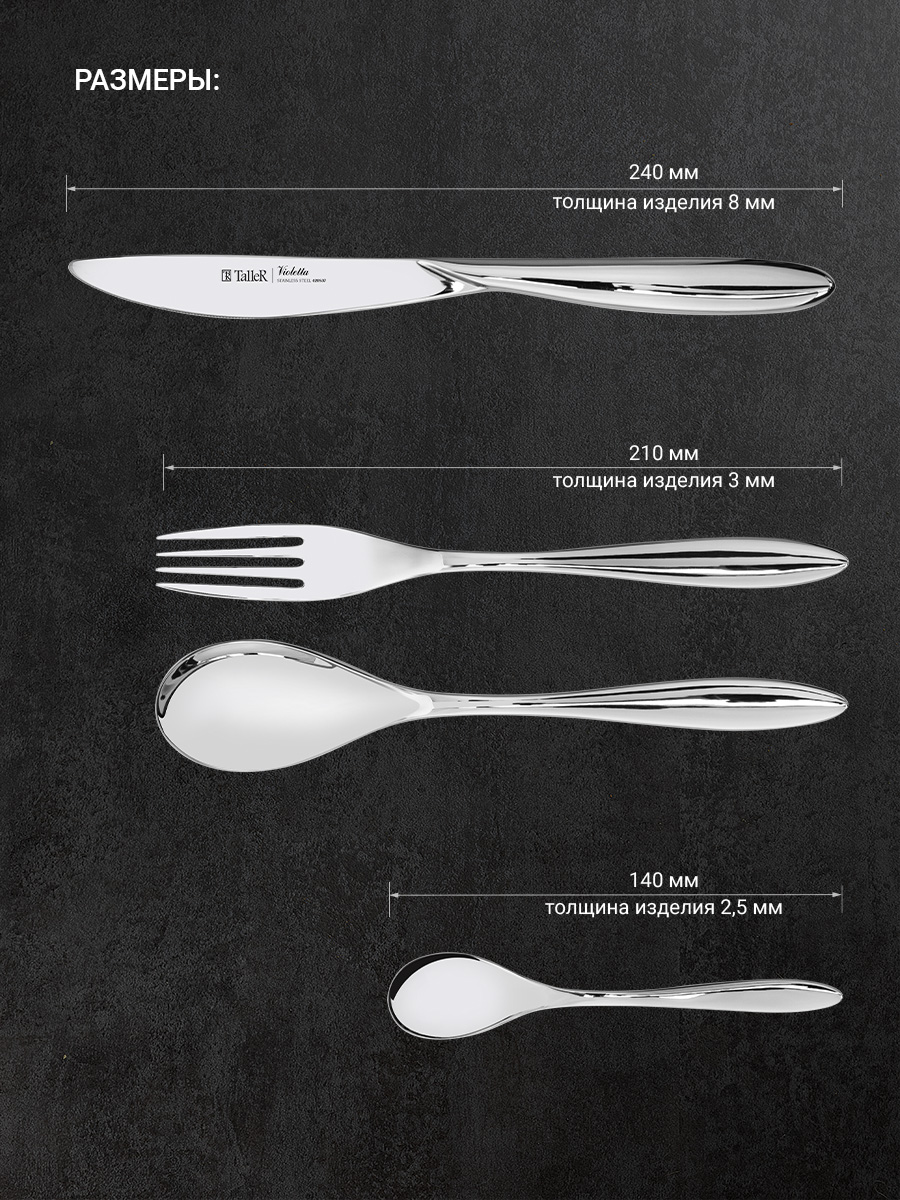 Параметры приборов: Нож - длина 23,5 см, масса 110 г, толщина ручки 8 мм Столовая ложка - длина 20,5 см, масса 61 г, толщина ручки 3,5 мм Вилка - длина 21 см, масса 51 г, толщина ручки 3,5 мм Чайная ложка - длина 14 см, масса 18 г, толщина ручки 3 мм Можно мыть в посудомоечной машине.
