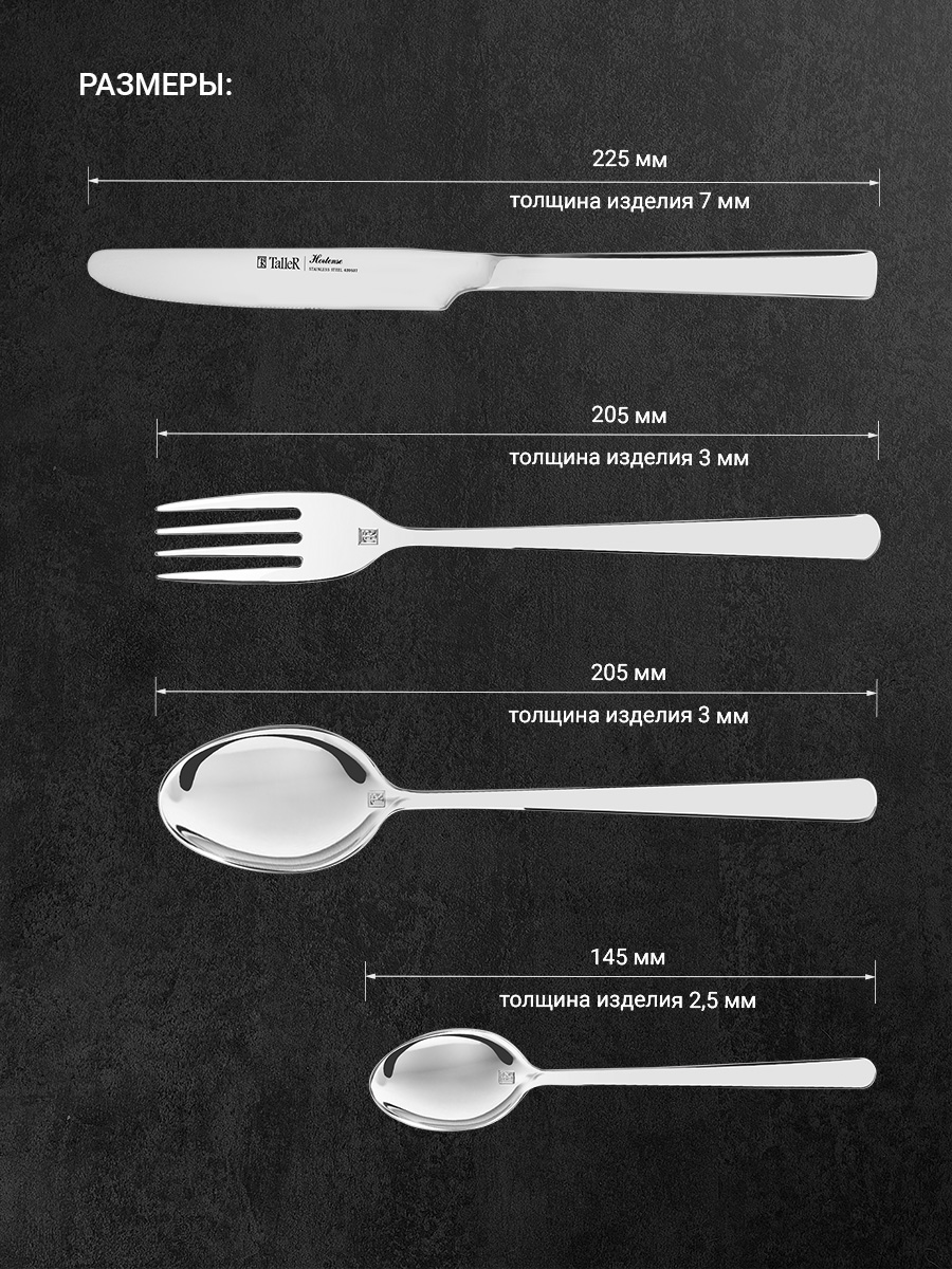 Приборы столовые (кроме лезвий ножей) изготовлены из высококачественной нержавеющей стали марки 18/10. Прочны и устойчивы к деформации. Обладают высокими антикоррозийными свойствами. Устойчивы к воздействию кислот и щелочей.