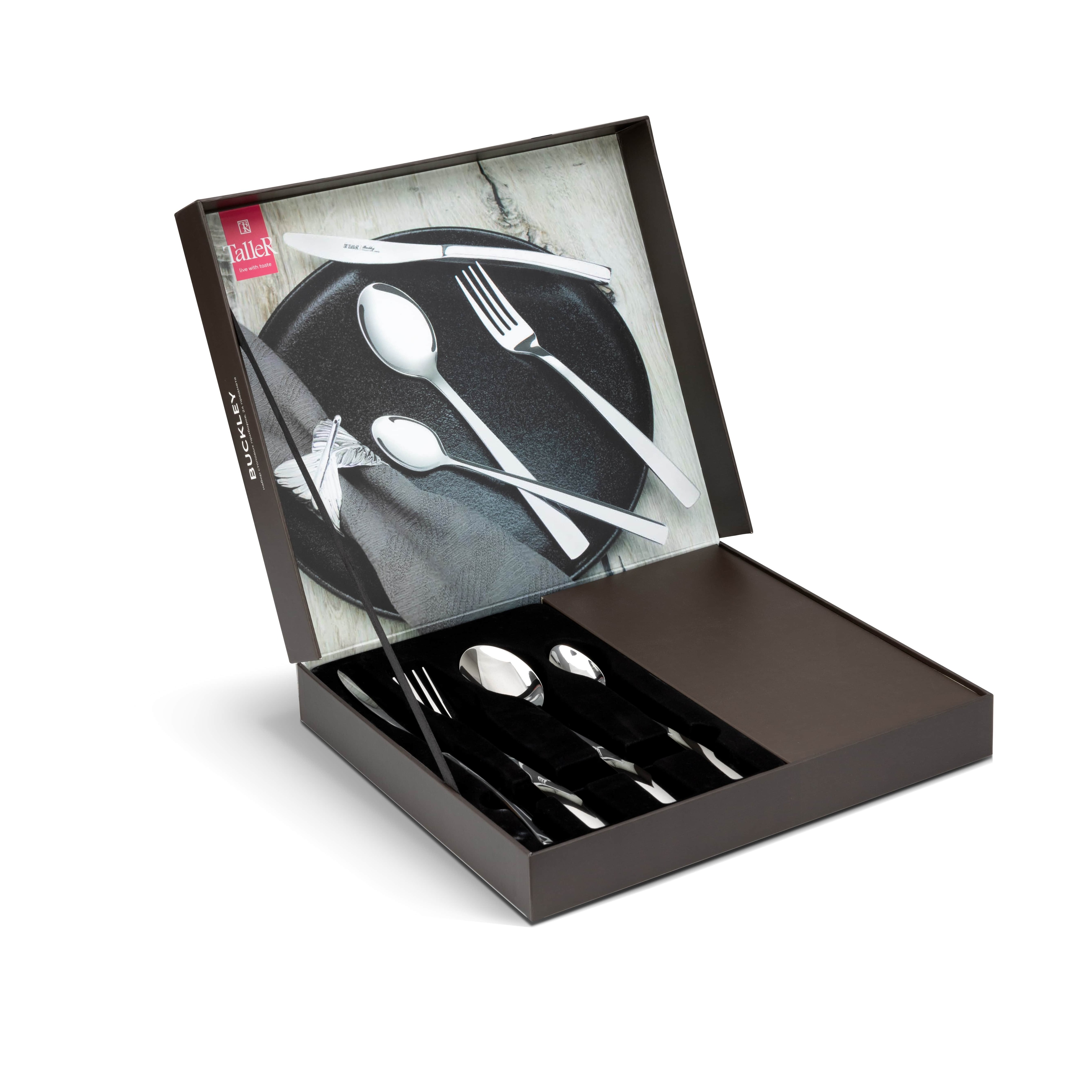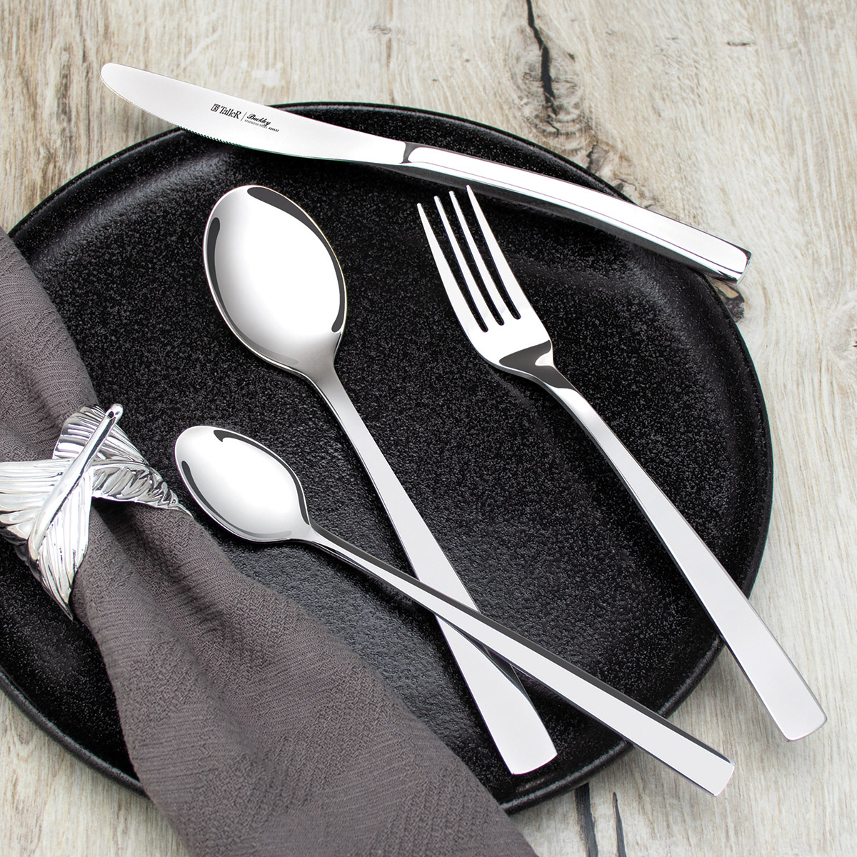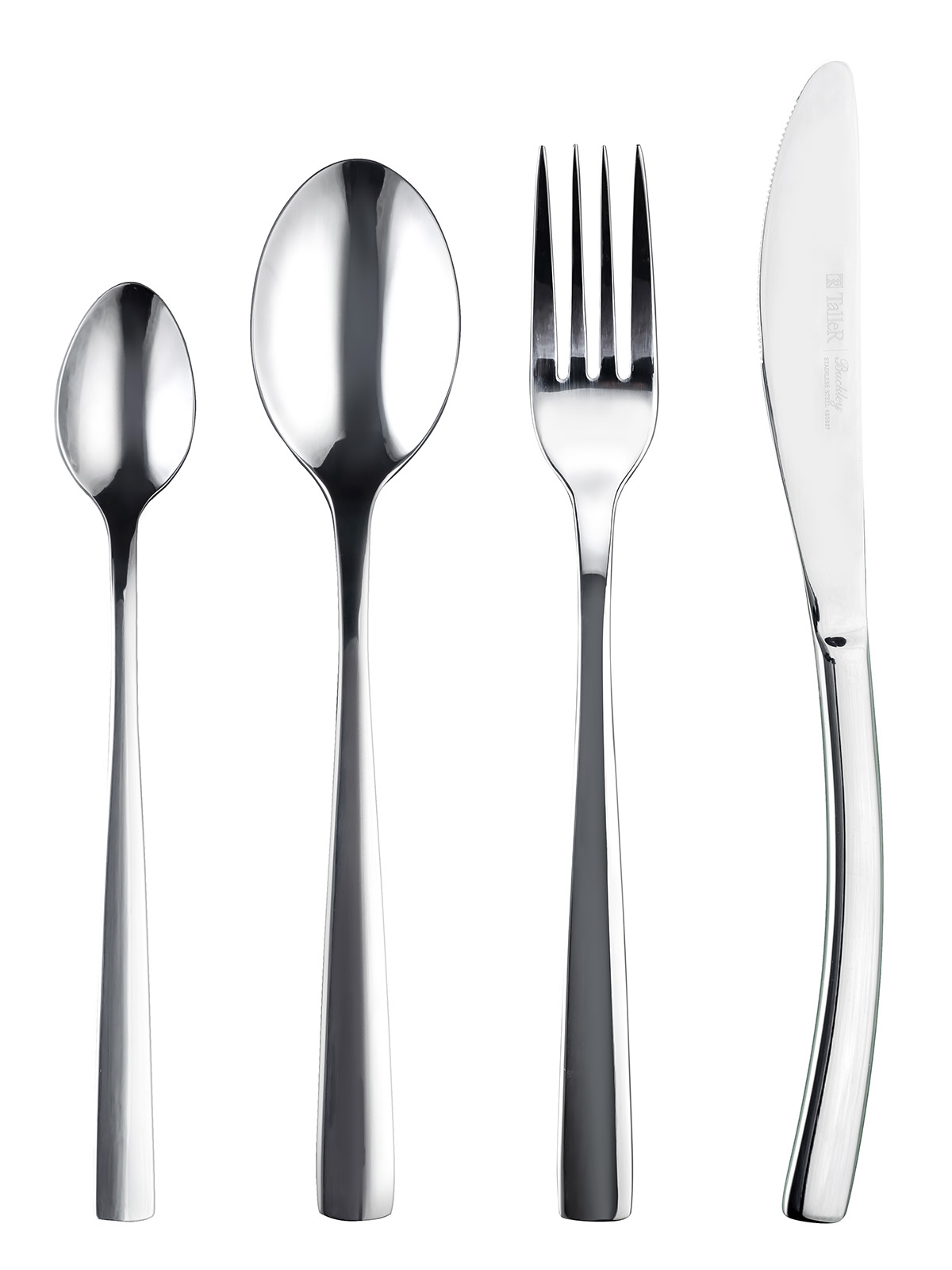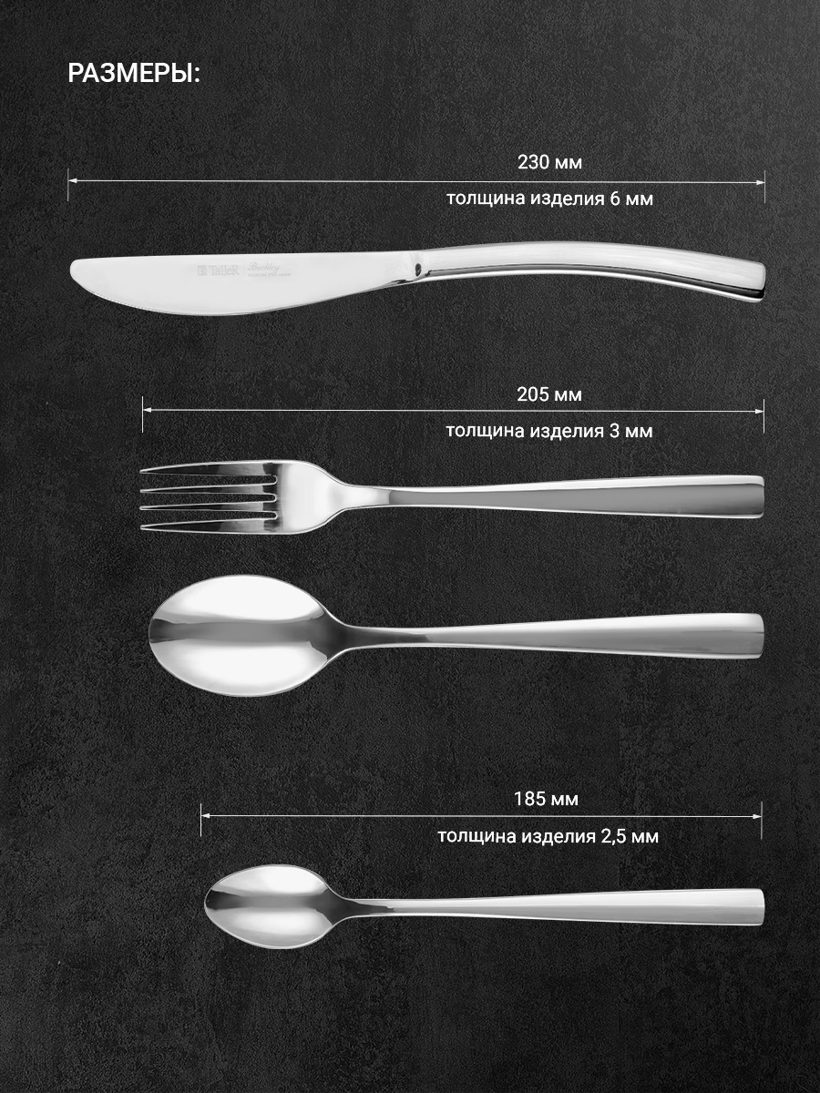 Приборы TalleR отличают идеальная обработка края и высокое качество полировки. Отлично сбалансированные ручки приборов позволяют приборам удобно ложиться в руку. Специальные утолщения на местах наибольшего износа приборов способствуют увеличению срока службы, препятствуют деформации. Особенность этого набора - длинные чайные ложки.