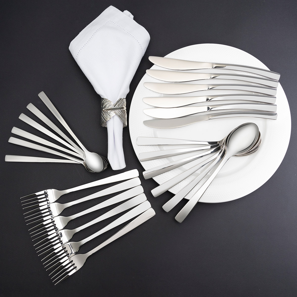 Состав набора: ложки столовые 6 шт., ложки чайные 6 шт., вилки 6 шт., ножи столовые 6 шт.
