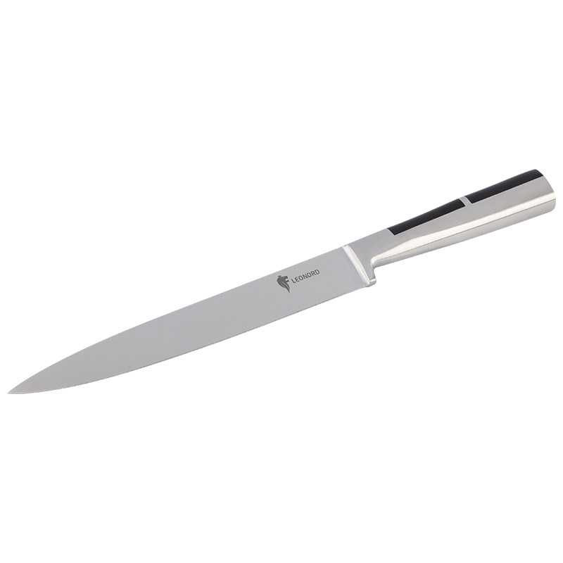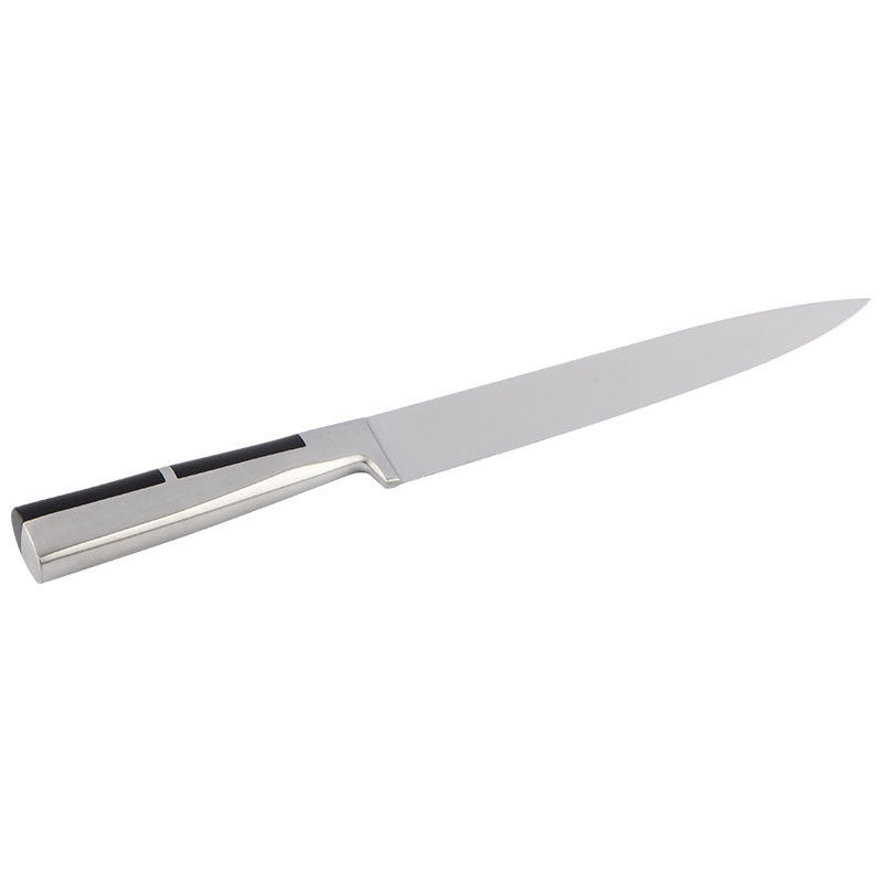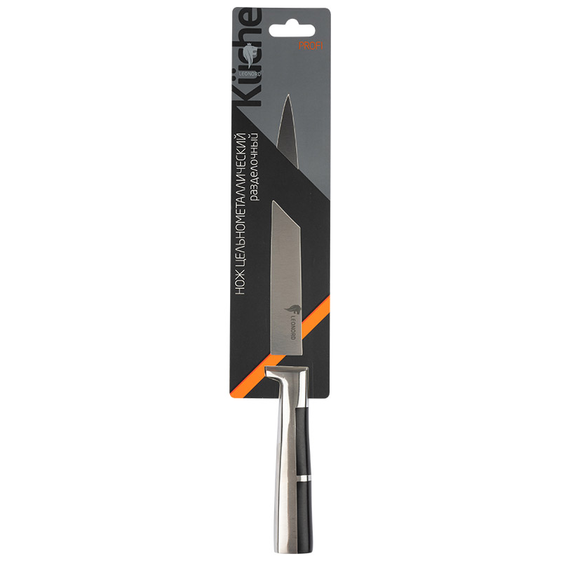 Кованый цельнометаллический нож из качественной высокоуглеродистой стали марки 3Cr13. Оригинальная эргономичная форма рукоятки Вставки из АБС пластика В отличие от недорогих штампованных ножей, лезвия у них не гнутся и держат заточку гораздо дольше других ножей. Толщина лезвия ножа - 2,3 мм. Длина лезвия: 20 см Гравировка на лезвии (логотип) Материал: нержавеющая сталь (лезвие - 3CR13, рукоятка - 430), АБС пластмасса Ножи PROFI с кованой рукояткой из нержавеющей стали и вставками из АБС-пластика отличаются удобством использования и долговечностью. Прочная и удобная эргономичная рукоятка не скользит в ладони при использовании и не впитывает запахи. Cталь отличается высокой износостойкостью и обладает прочной режущей кромкой. Ножи успешно справляются с нарезкой колбас и сыров, измельчением фруктов и овощей, разделкой мяса и рыбы.