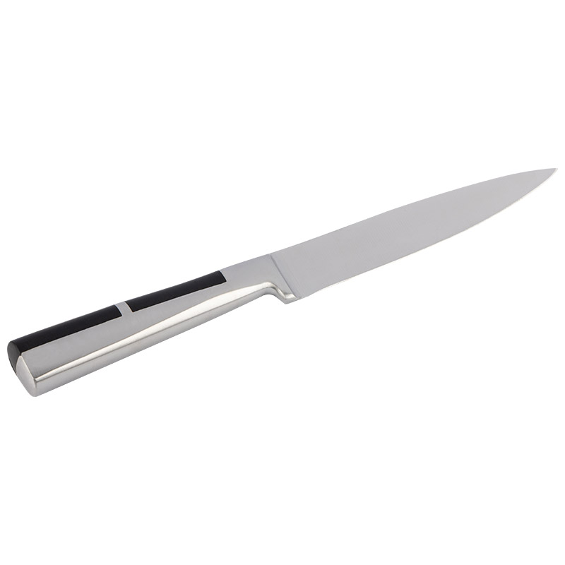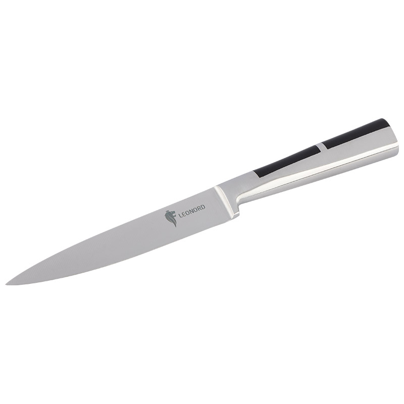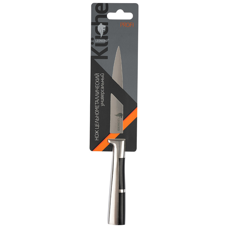 Кованый цельнометаллический нож из качественной высокоуглеродистой стали марки 3Cr13. Оригинальная эргономичная форма рукоятки Вставки из АБС пластика В отличие от недорогих штампованных ножей, лезвия у них не гнутся и держат заточку гораздо дольше других ножей. Толщина лезвия ножа - 1,7 мм. Длина лезвия: 12,7 см Гравировка на лезвии (логотип) Материал: нержавеющая сталь (лезвие - 3CR13, рукоятка - 430), АБС пластмасса Ножи PROFI с кованой рукояткой из нержавеющей стали и вставками из АБС-пластика отличаются удобством использования и долговечностью. Прочная и удобная эргономичная рукоятка не скользит в ладони при использовании и не впитывает запахи. Cталь отличается высокой износостойкостью и обладает прочной режущей кромкой. Ножи успешно справляются с нарезкой колбас и сыров, измельчением фруктов и овощей, разделкой мяса и рыбы.