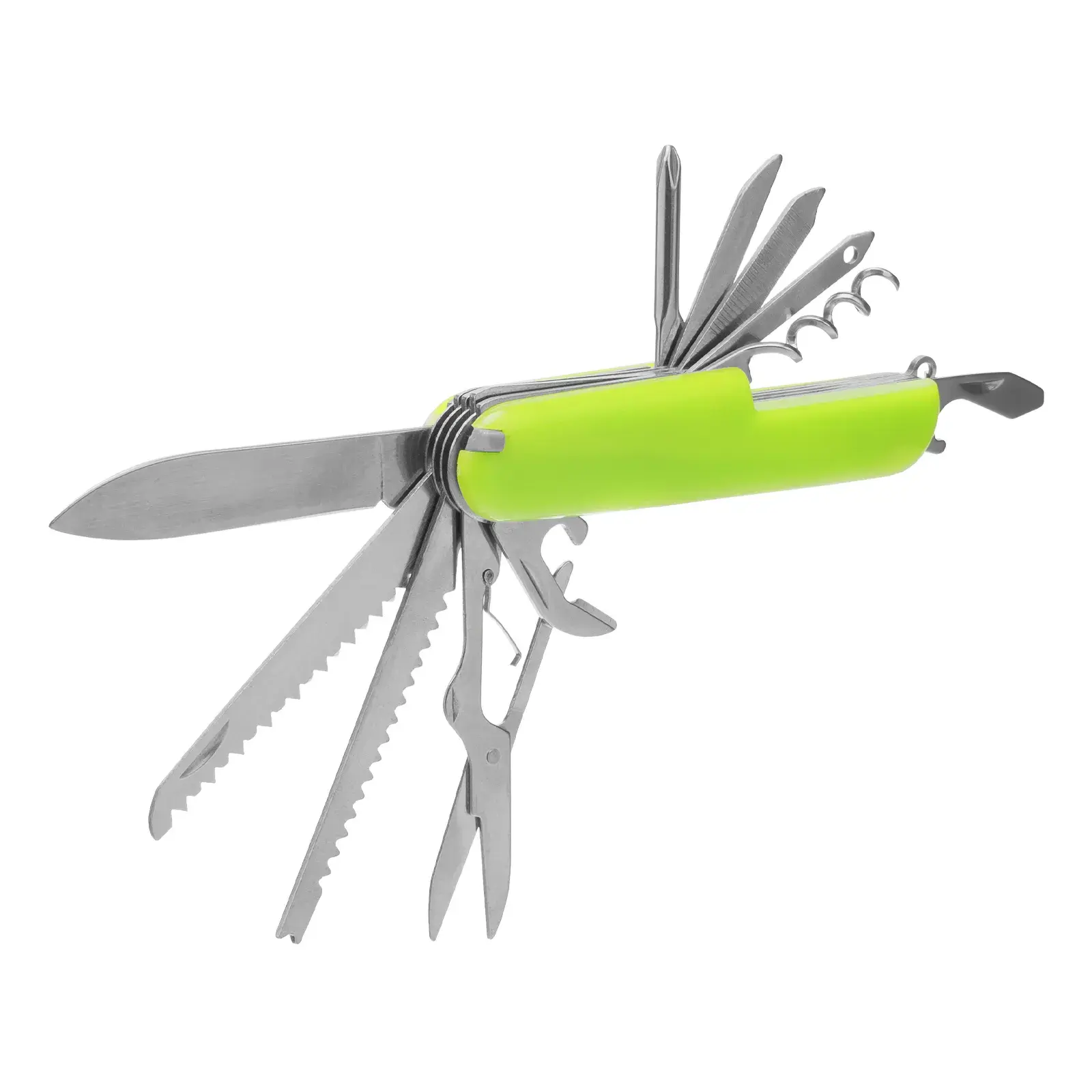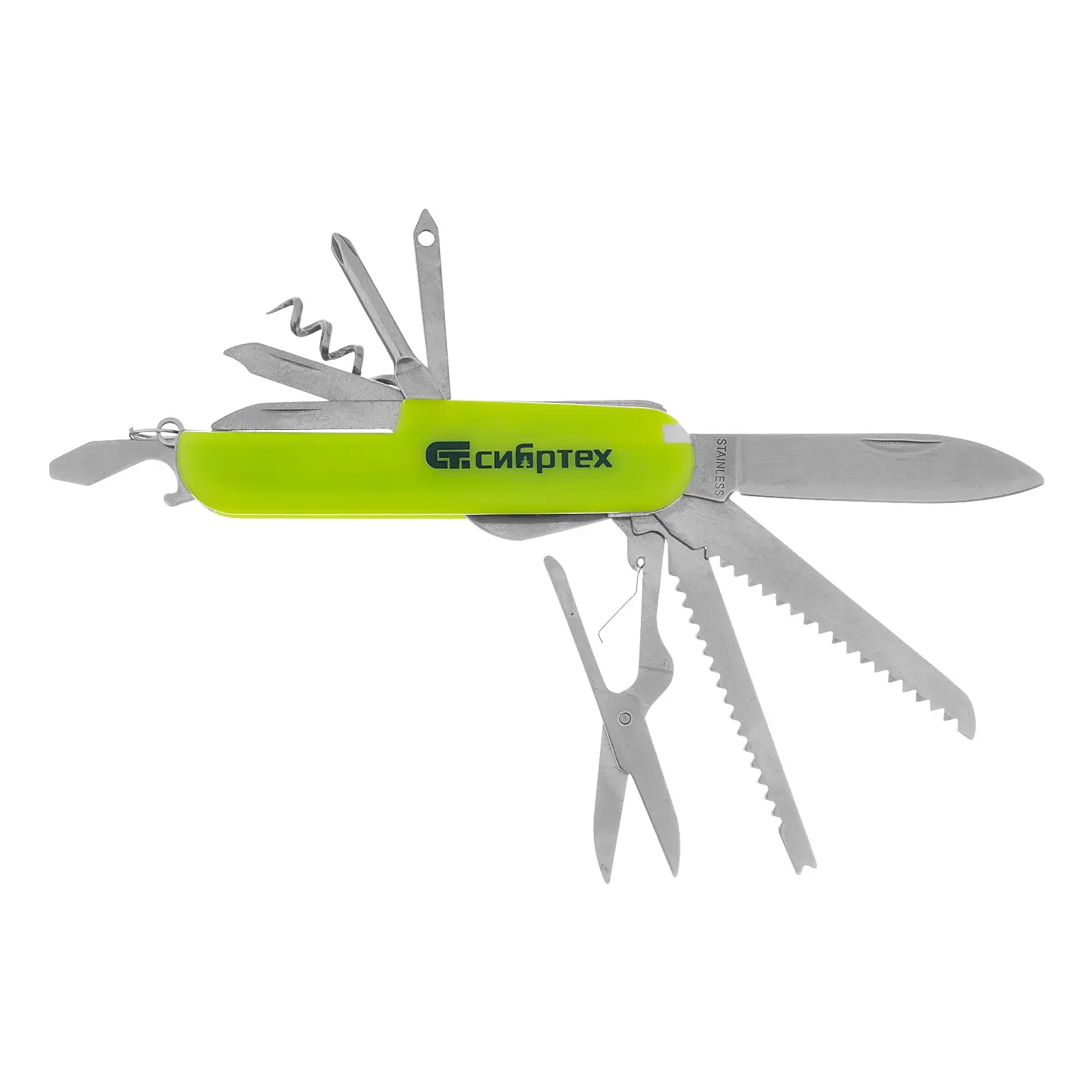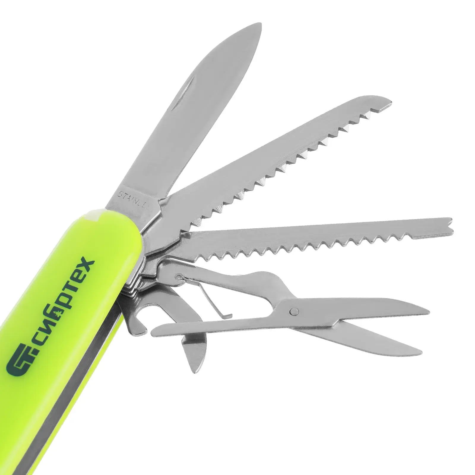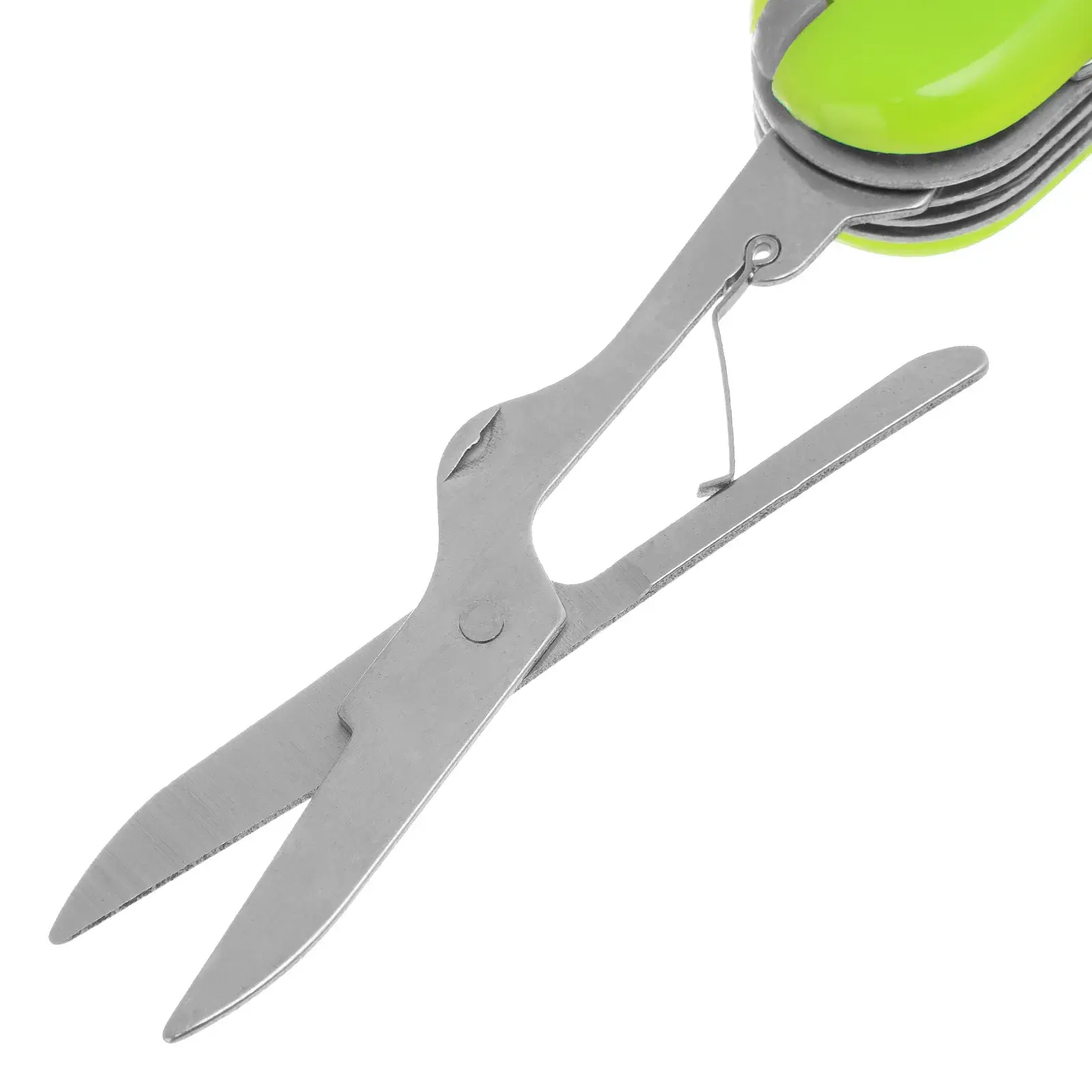 Резка картона, бумаги, веревок, пиление тонких веток — производитель предусмотрел нож, ножницы и пилу.