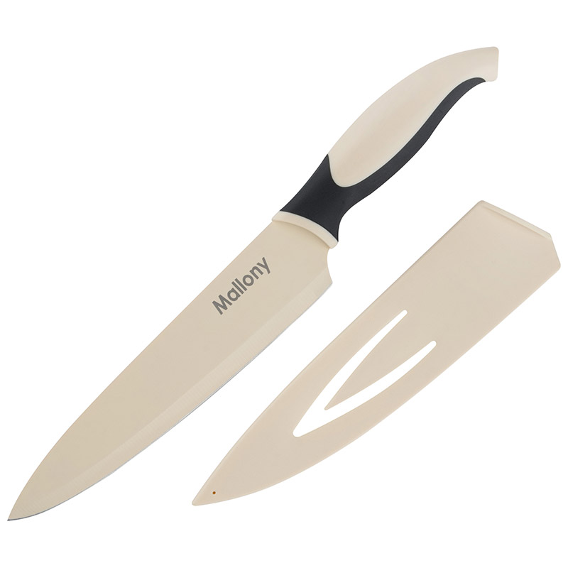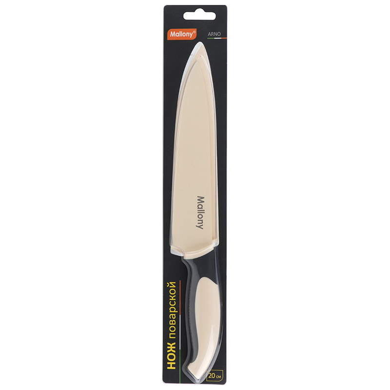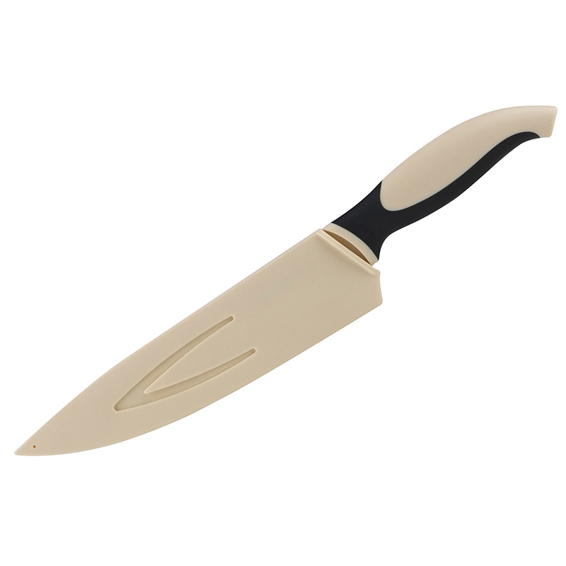 Эргономичная пластиковая рукоятка с элементами из ТПР Лезвие с покрытием non-stick Пластиковый чехол на лезвие в комплекте Длина лезвия: 20 см Толщина лезвия: 1,5 мм Материал: нержавеющая сталь (SS 2CR14), полипропилен, ТПР