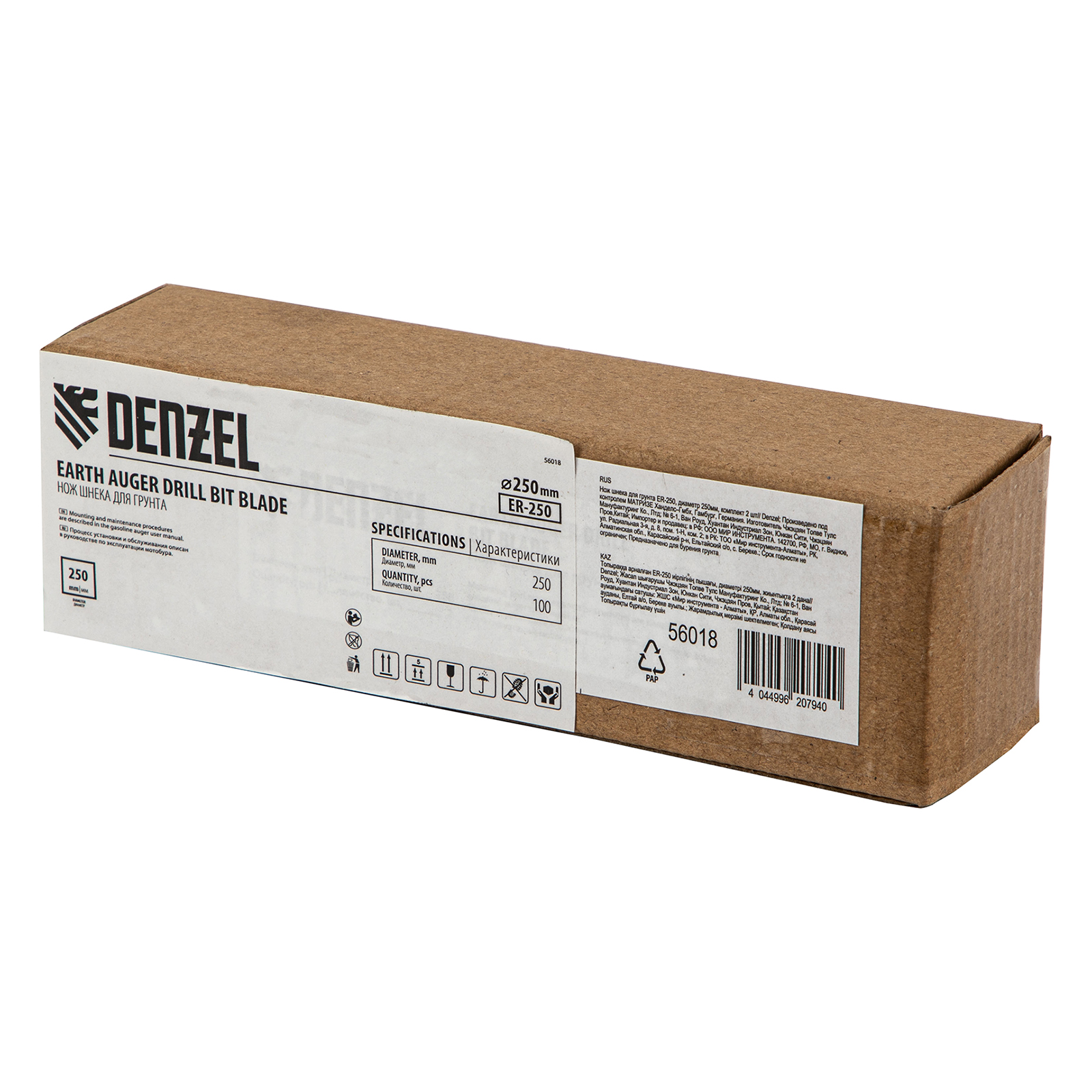 Нож шнека для грунта Denzel ER-250 56018 диаметром 250 мм, 2 шт. в комплекте, используется совместно со шнеком Denzel ER-250, артикул 56009. Шнек с лезвием устанавливается на мотобур для сверления отверстий в грунте. Оптимально подходит для выполнения строительных и ремонтных работ на дачном участке и небольших строительных площадках.ПреимуществаКачественное исполнение — лезвия из прочной легированной стали 34CR4 долго держат заточку и позволяют справляться даже с замерзшим грунтом.Антикоррозионные свойства — защитное покрытие предотвращает преждевременное разрушение ножей.Ножи выполнены съемными — это позволяет избежать замены всего шнека при их поломке.2 штуки в комплекте — запасное лезвие позволяет быстро заменить затупившуюся или сломанную оснастку, не прекращая рабочий процесс надолго.