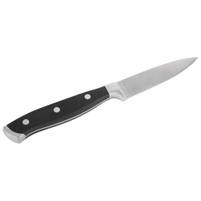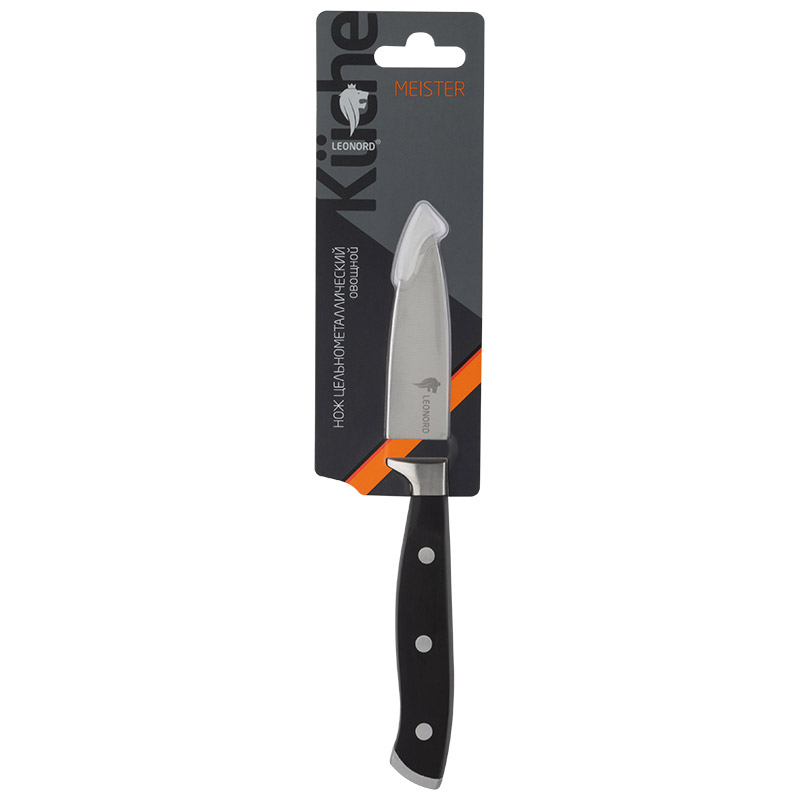 Нож цельнометаллический с вставкой из АБС пластика на рукоятке Длина лезвия: 8,6 см Толщина стали: 2,0 мм Гравировка на лезвии (логотип) Материал: нержавеющая сталь (3CR13, 430), АБС пластмасса (матовое покрытие) Ножи MEISTER с кованой рукояткой из нержавеющей стали и АБС-пластика отличаются удобством использования и долговечностью. Прочная и удобная эргономичная рукоятка не скользит в ладони при использовании и не впитывает запахи. Cталь отличается высокой износостойкостью и обладает прочной режущей кромкой. Ножи успешно справляются с нарезкой колбас и сыров, измельчением фруктов и овощей, разделкой мяса и рыбы
