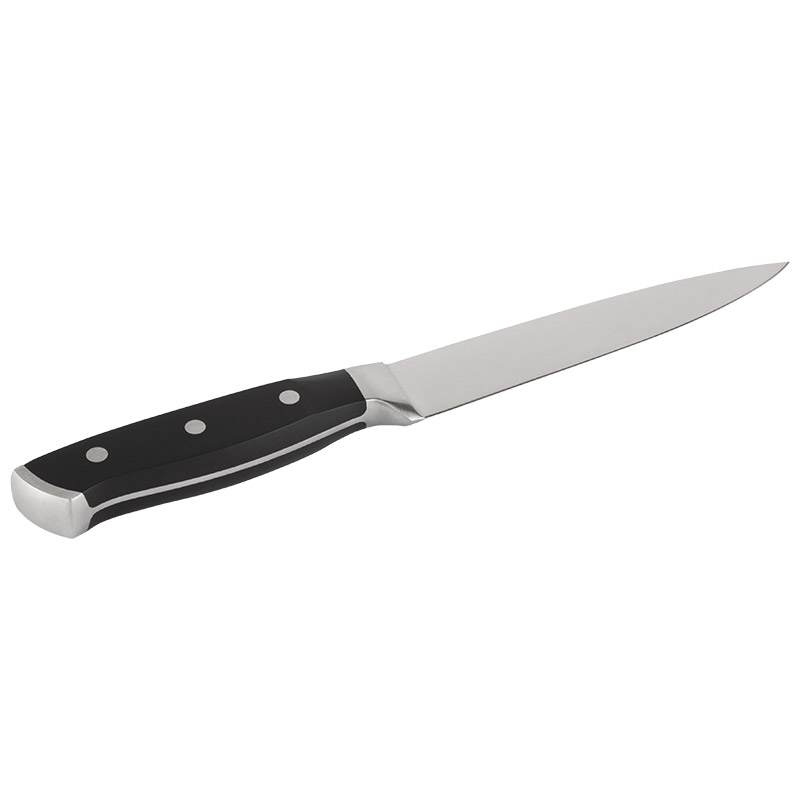 Нож цельнометаллический с вставкой из АБС пластика на рукоятке Длина лезвия: 15 см Толщина стали: 2,5 мм Гравировка на лезвии (логотип) Материал: нержавеющая сталь (3CR13, 430), АБС пластмасса (матовое покрытие) Ножи MEISTER с кованой рукояткой из нержавеющей стали и АБС-пластика отличаются удобством использования и долговечностью. Прочная и удобная эргономичная рукоятка не скользит в ладони при использовании и не впитывает запахи. Cталь отличается высокой износостойкостью и обладает прочной режущей кромкой. Ножи успешно справляются с нарезкой колбас и сыров, измельчением фруктов и овощей, разделкой мяса и рыбы.