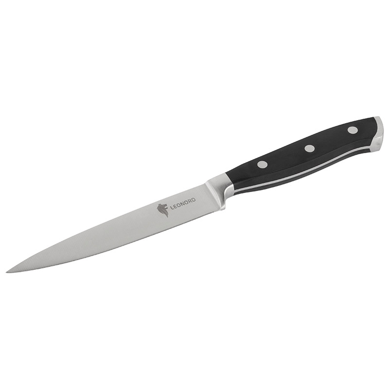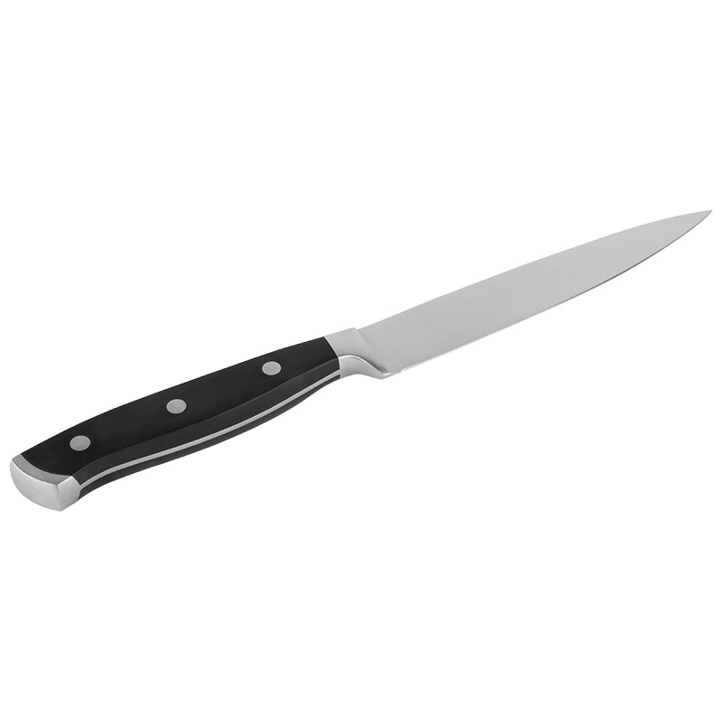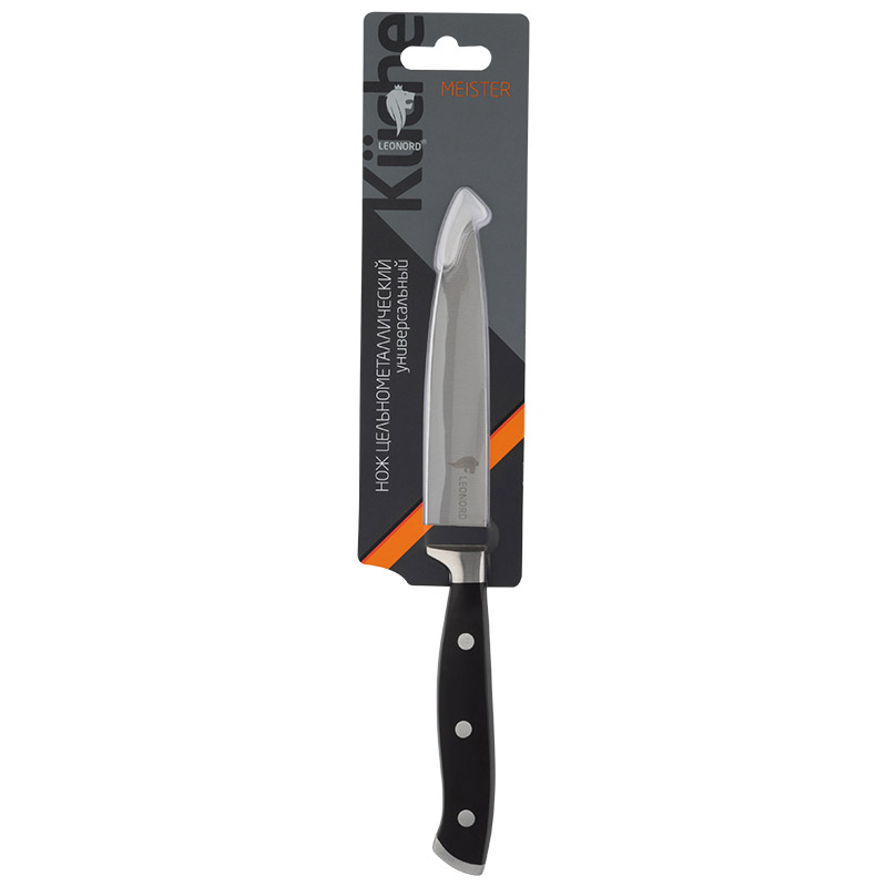 Нож цельнометаллический с вставкой из АБС пластика на рукоятке Длина лезвия: 12,5 см Толщина стали: 2,0 мм Гравировка на лезвии (логотип) Материал: нержавеющая сталь (3CR13, 430), АБС пластмасса (матовое покрытие) Ножи MEISTER с кованой рукояткой из нержавеющей стали и АБС-пластика отличаются удобством использования и долговечностью. Прочная и удобная эргономичная рукоятка не скользит в ладони при использовании и не впитывает запахи. Cталь отличается высокой износостойкостью и обладает прочной режущей кромкой. Ножи успешно справляются с нарезкой колбас и сыров, измельчением фруктов и овощей, разделкой мяса и рыбы.