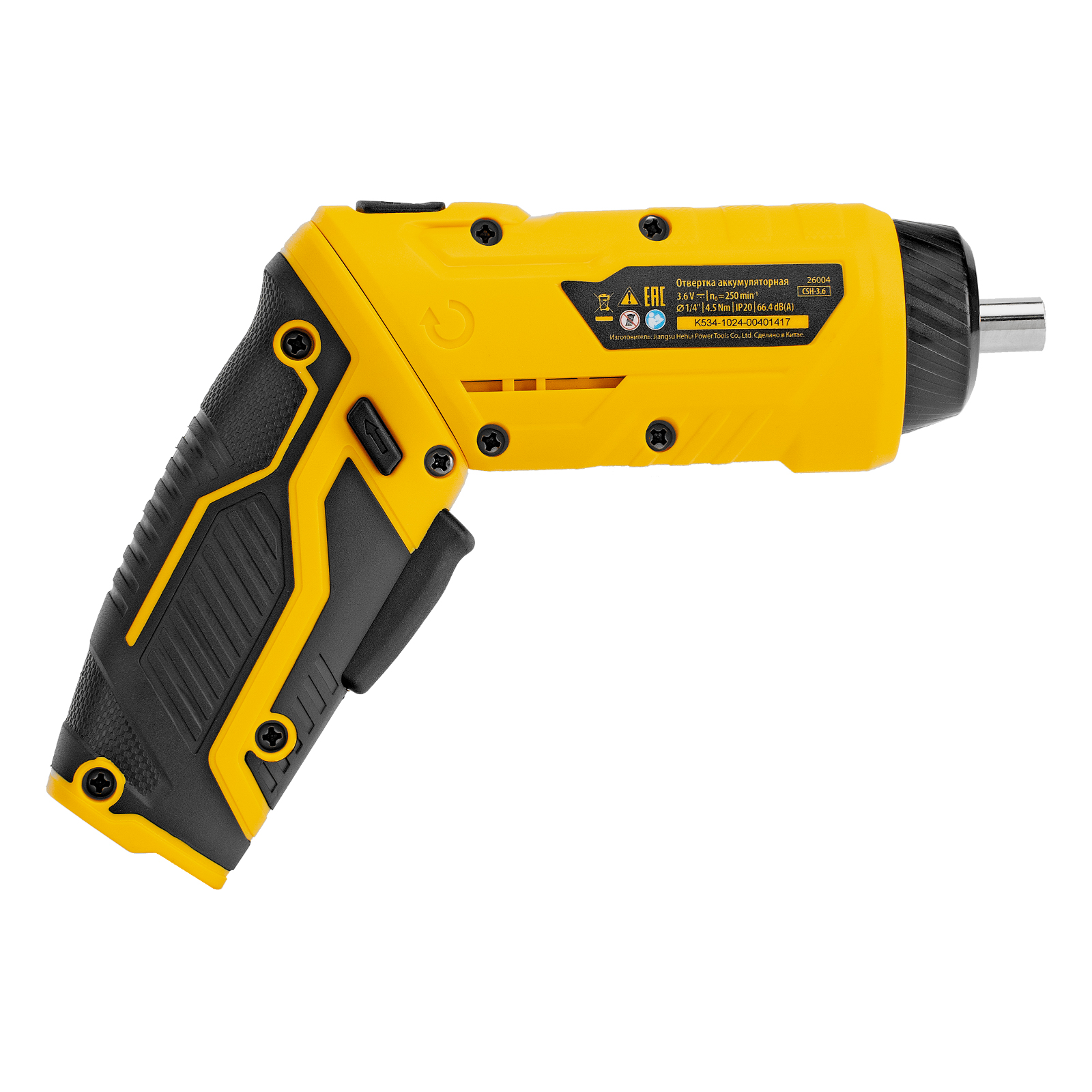 Аккумуляторная отвертка Denzel CSH-3.6 26004 работает от источника питания Li-Ion 3,6 В емкостью 1,5 А·ч и поставляется с набором из 54 бит. Предназначена для закручивания и откручивания резьбового крепежа в ходе проведения монтажных работ. Максимальный крутящий момент составляет 4,5 Н·м, что позволяет эффективно решать поставленные задачи. Патрон снабжен магнитом, поэтому оснастка надежно фиксируется в нем и не выпадает во время работы. Отвертка пригодится в быту.ПреимуществаБлокировка шпинделя — отвертку можно использовать для ручной затяжки крепежа при необходимости.Функция реверса — направление вращения патрона меняется одним движением, что упрощает и ускоряет работу.Комфортная работа при слабом освещении — подсветка рабочей зоны включается одновременно с запуском двигателя.Эргономичность — поворотная рукоятка фиксируется в одном из двух положений для максимально удобной работы.Безопасность — инструменту присвоена II степень защиты от поражения электрическим током.Защита от случайного пуска — производитель предусмотрел блокировку включения.Масса 350 г — отверткой можно долго работать без ощущения усталости.Расширенная комплектация — отвертка поставляется с зарядным устройством, кабелем USB, магнитным адаптером и набором из 54 бит.Удобное хранение и транспортировка — аккумуляторная отвертка с аксессуарами упакована в пластиковый кейс.Гарантия 3 года — надежность инструмента подтверждена производителем.
