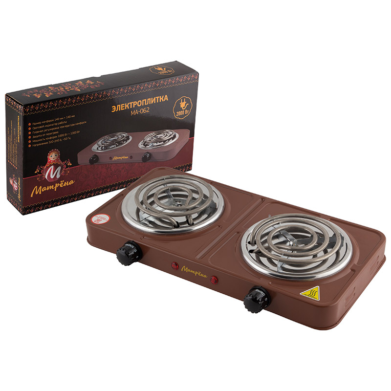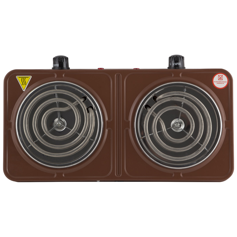 Размер конфорок 140 мм + 140 мм Световой индикатор работы Плавная регулировка температуры конфорки Защита от перегрева Мощность конфорок 1000 Вт + 1000 Вт Цвет коричневый Длина шнура 63 см