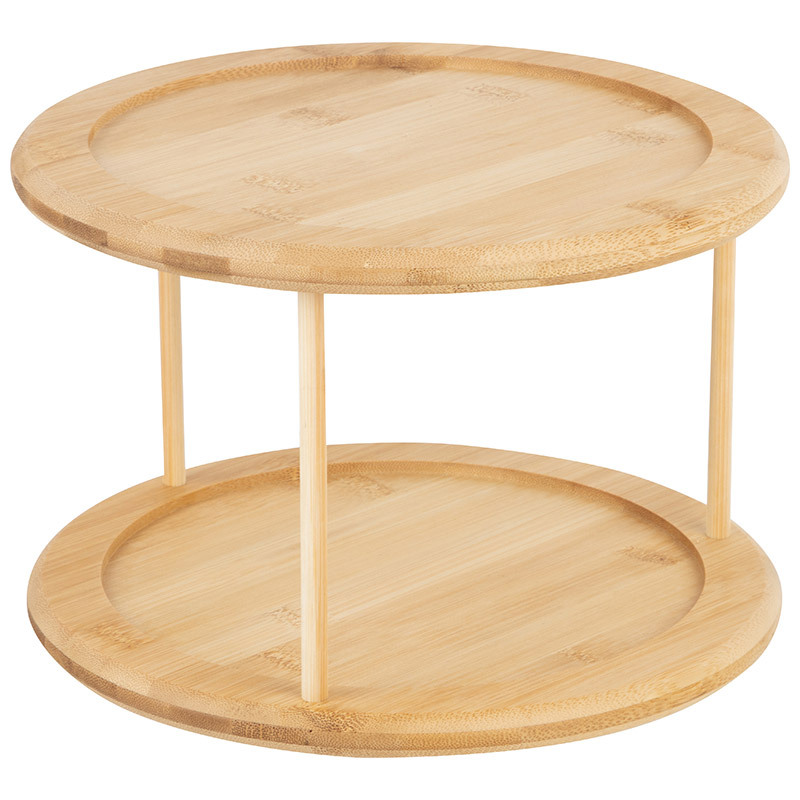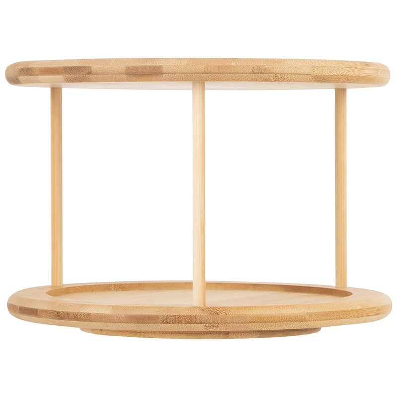 Подставка для кухни двухъярусная круглая Универсальная подставка из бамбука поможет сэкономить место на вашей кухне, обеспечит удобное и компактное хранение небольших банок, бутылок, специй, соусов, принадлежностей для чая/кофе и пр. Вращение на 360 градусов позволяет легко найти и взять нужные предметы. Лаконичный дизайн и удобный размер делают органайзер действительно универсальным решением для организации пространства - на кухонных полках и в холодильнике, в ванной и прихожей, даже на рабочем столе этот аксессуар поможет поддерживать порядок. Размер: 25,2*25,2*17,7 см Вес: 900 гр Материал: бамбук