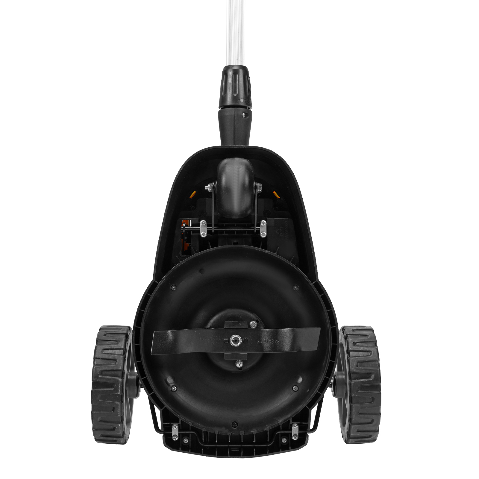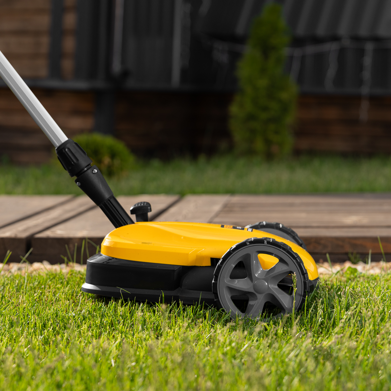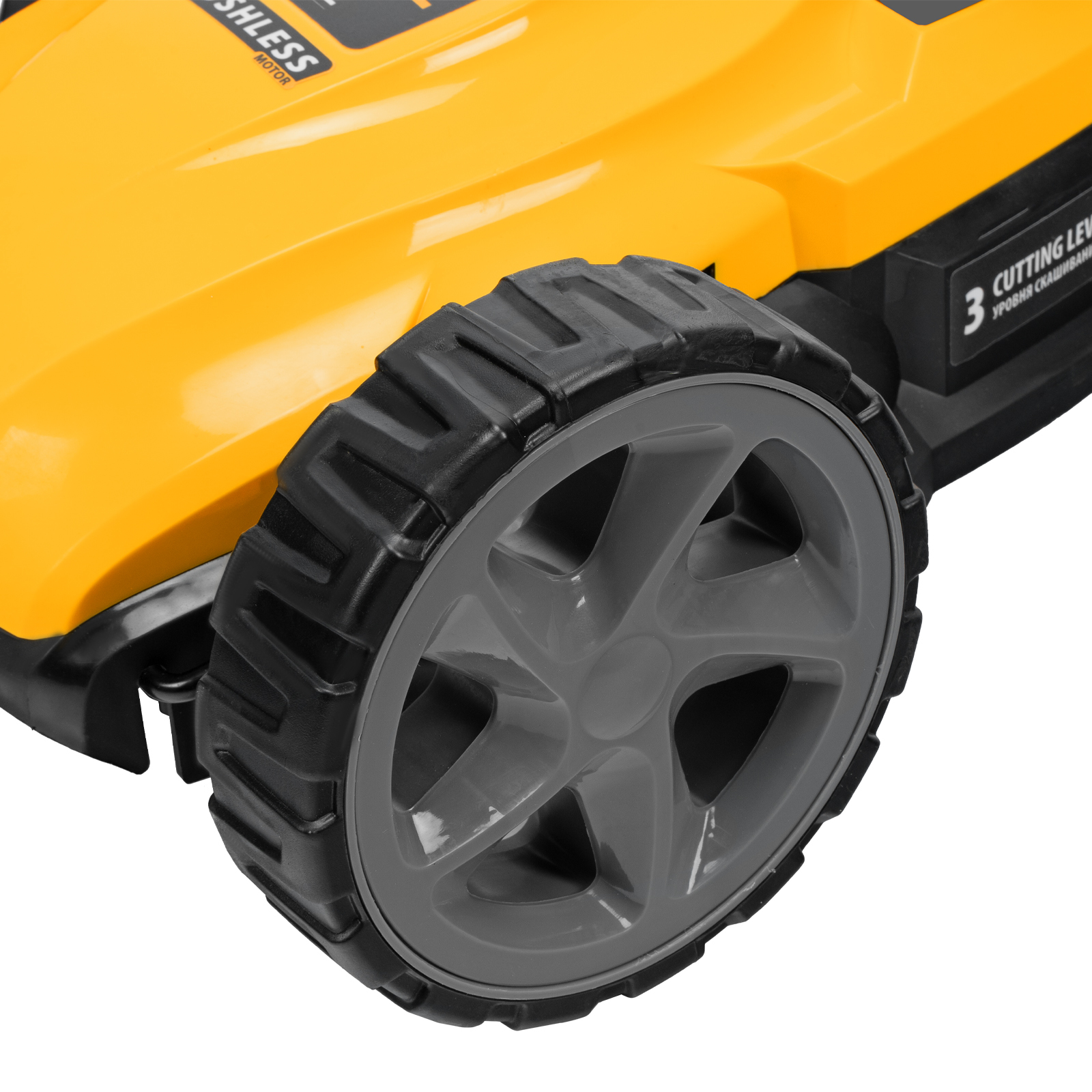 Мобильность — благодаря небольшому весу 3,7 кг (без АКБ), двум большим и одному малому сферическому колесу технику легко перемещать, косить траву удобно даже в узких и труднодоступных местах.