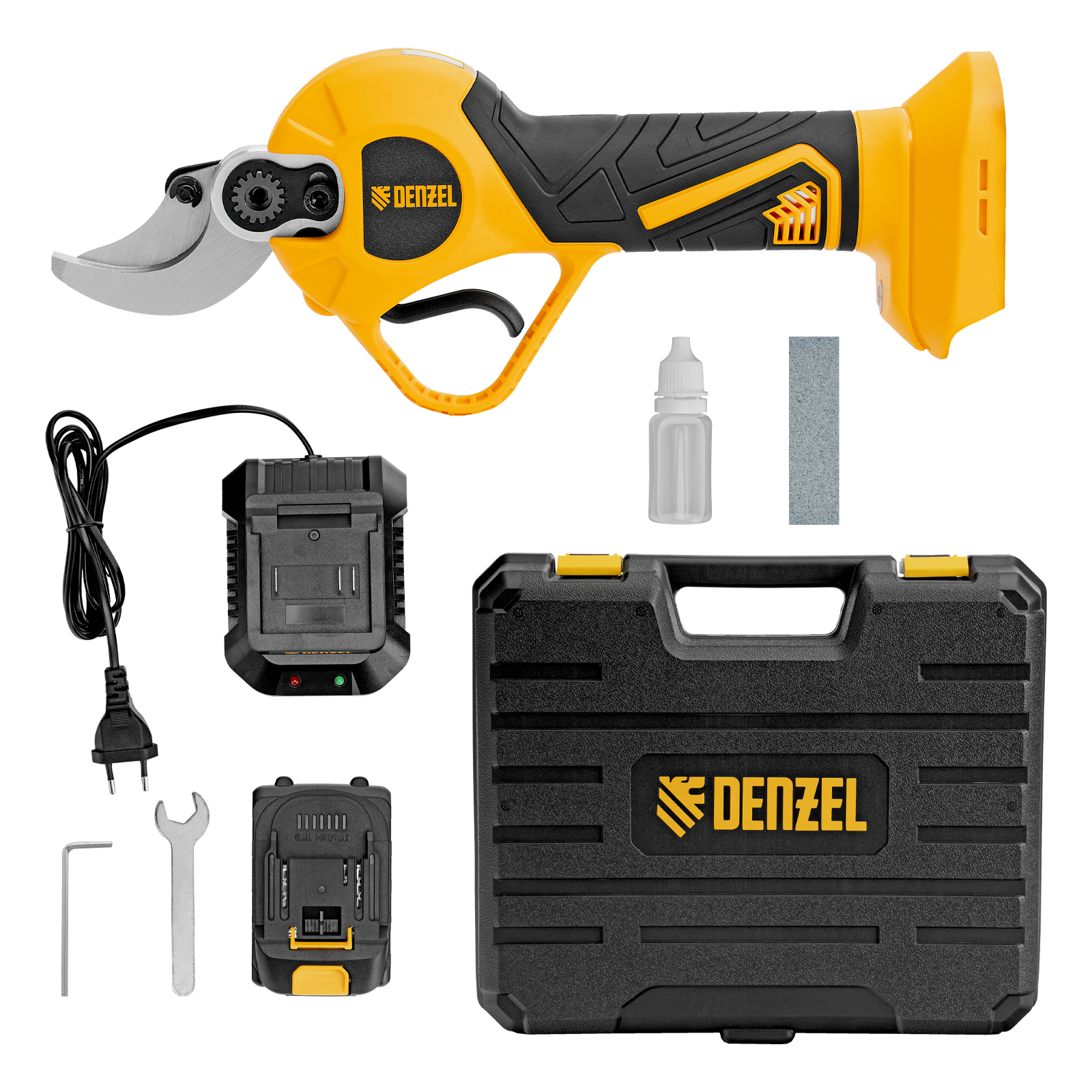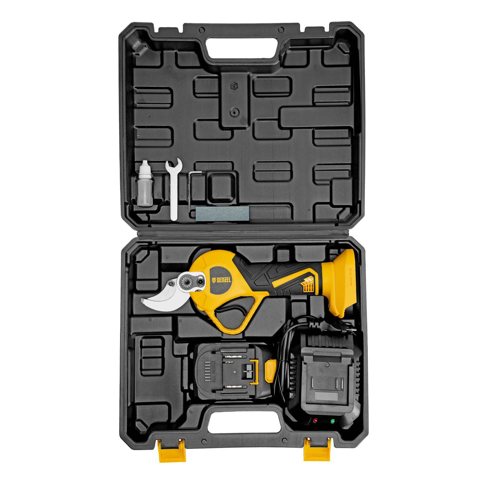 Широкая комплектация — секатор поставляется с аккумулятором, зарядным устройством, гаечным и шестигранным ключами, масленкой и точильным камнем.