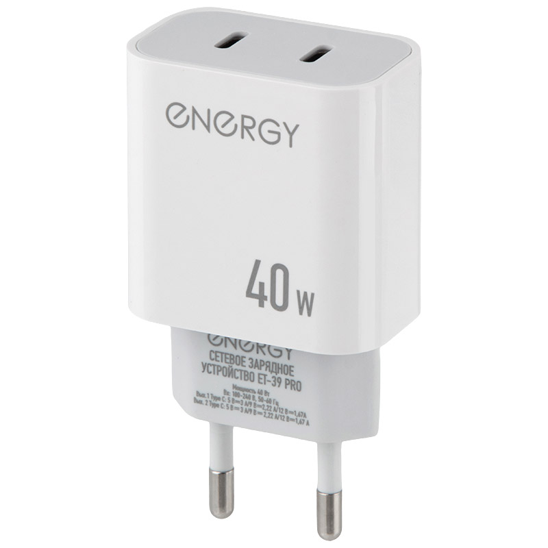 Мощность PD 40 Вт Type C, Type C Вход: 100-240 В, 50-60 Гц 0,8A Выход PD1: 5В-3А/9В-2,22А/12В-1,67А Выход PD2: 5В-3А/9В-2,22А/12В-1,67А Выход: PD1+PD2=5В 3А