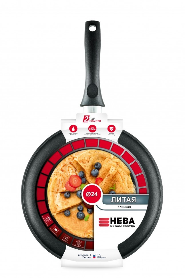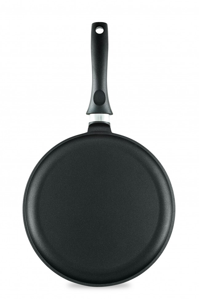 Блинная сковорода имеет низкий борт и удобную ручку, благодаря чему легко переворачивать и снимать блины. Утолщенное дно обеспечивает особые термоаккумулирующие свойства: блин равномерно пропекается по всей толщине и красиво румянится с обеих сторон. Благодаря антипригарному покрытию блины всегда легко снимаются со сковороды и не пригорают, даже при выпекании без использования масла.