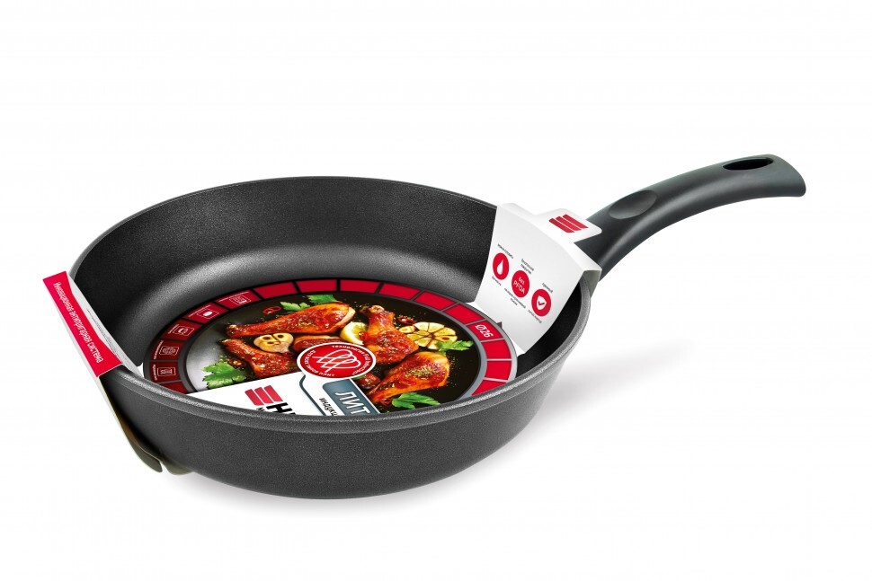 Сковорода многофункциональна, обеспечивает комфорт и легкость в использовании. Форма сковороды идеально подходит для большинства рецептов. Благодаря высоким бортам и большой полезной площади дна, сковорода отлично подходит для приготовления таких блюд как котлеты, шницели, тефтели, голубцы, жаркое, гуляш.