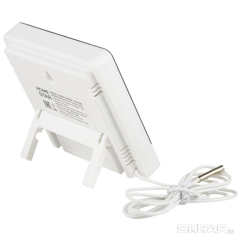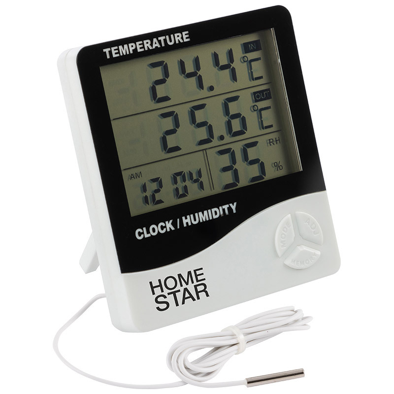 Электронный термометр-гигрометр Выносной проводной датчик 3 показателя Показатель 1: t в помещении °C Показатель 2: t на улице °C Показатель 3: относительная влажность в помещении % Часы Будильник Диапазон измерения t: от -20°С до +70°С Погрешность: +/- 1° Цена деления: 0,1°С Диапозон измерения относительной влажности: 10%-99% Работа от батарейки 1ААА (не входит в комплект) Возможно настенная или настольная установка