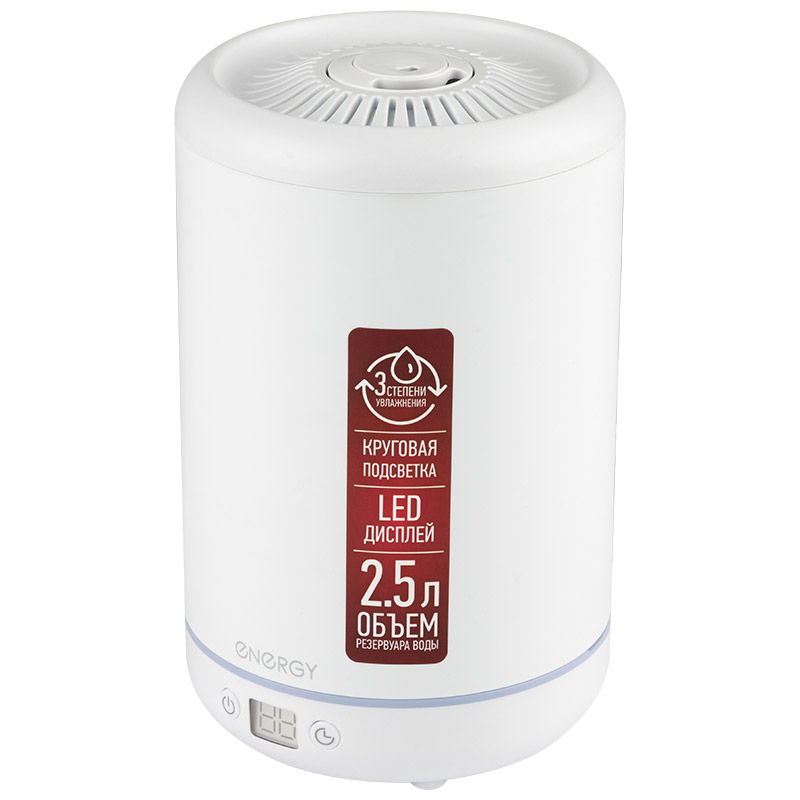 Регулировка степени увлажнения воздуха LED дисплей 3 степени увлажнения воздуха Таймер 2-8 часов Верхний залив воды – достаточно снять крышку Автоматическое отключение при отсутствии воды Материал корпуса пластик Подсветка круговая (7 цветов) Продолжительность работы 10-12 часов Объем резервуара воды 2,8л Максимальное распыление 300 мл/час Уровень шума < 35 Дб Площадь эффективной эксплуатации до 30 м² (высота потолка 3 м) Мощность 22Вт Длина сетевого провода -120см