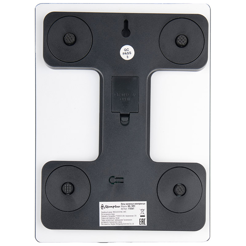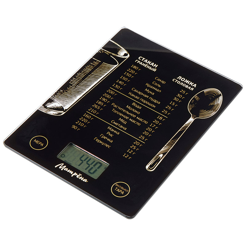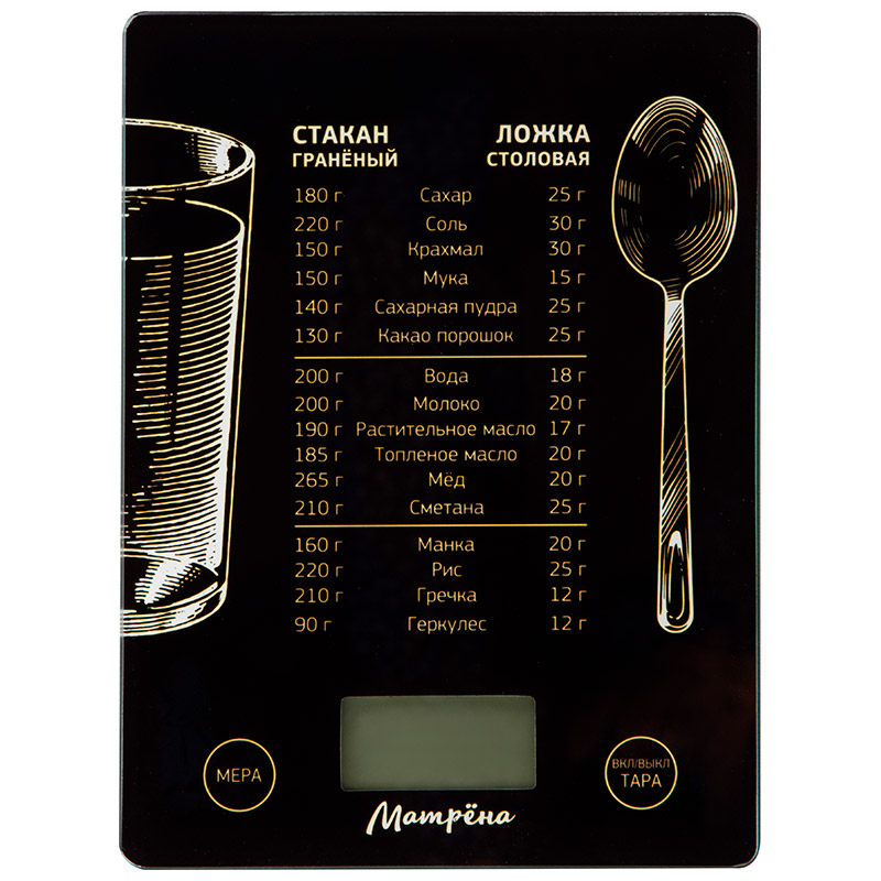 Стеклянная поверхность 20 * 15 см LCD дисплей (без подсветки) Максимальная нагрузка 7 кг Сенсорное управление Выбор единицы измерения: грамм, килограмм, фунт, мл Цена деления 1 грамм Функция "Тара" АвтоотключениеПроризиненные ножки Индикатор перегрузки и заряда батареи Питание от батарейки 1*CR2032 (3В), входит в комплект Напряжение: 3 В Состав: стекло, пластмасса.