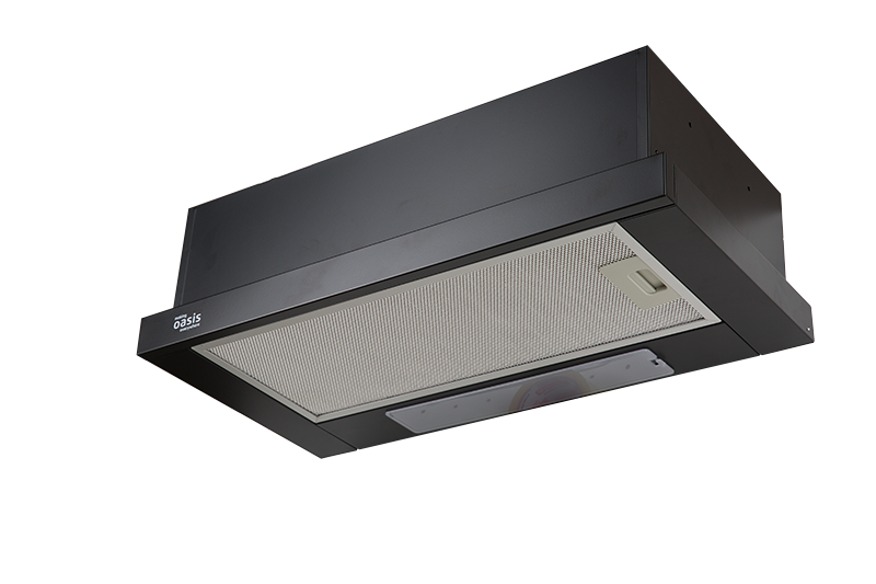 Вытяжка кухонная встраиваемая довольно компактна и монтируется в специальный навесной шкаф над плитой. При этом «на виду» остаётся лишь узкая панель, которая выдвигается вперёд при работе вытяжки. Встраиваемая вытяжка обеспечивает более полный охват поверхности плиты, чтобы грязный воздух не поднимался к потолку.